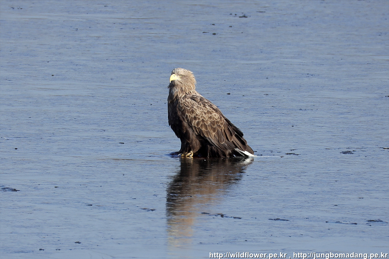 흰꼬리수리 - 겨울깃. 멸종위기종 1급이라고 합니다. 멀찌감치 떨어져 있어 그런 지 경계하는 내색은 안보이네요. 한참동안 얼음 위에서 머물러 있는 것을 보고 웬지 신경 쓰였지만, 방해하지 말고 제 갈길을 가야죠. 크롭 사진입니다.
