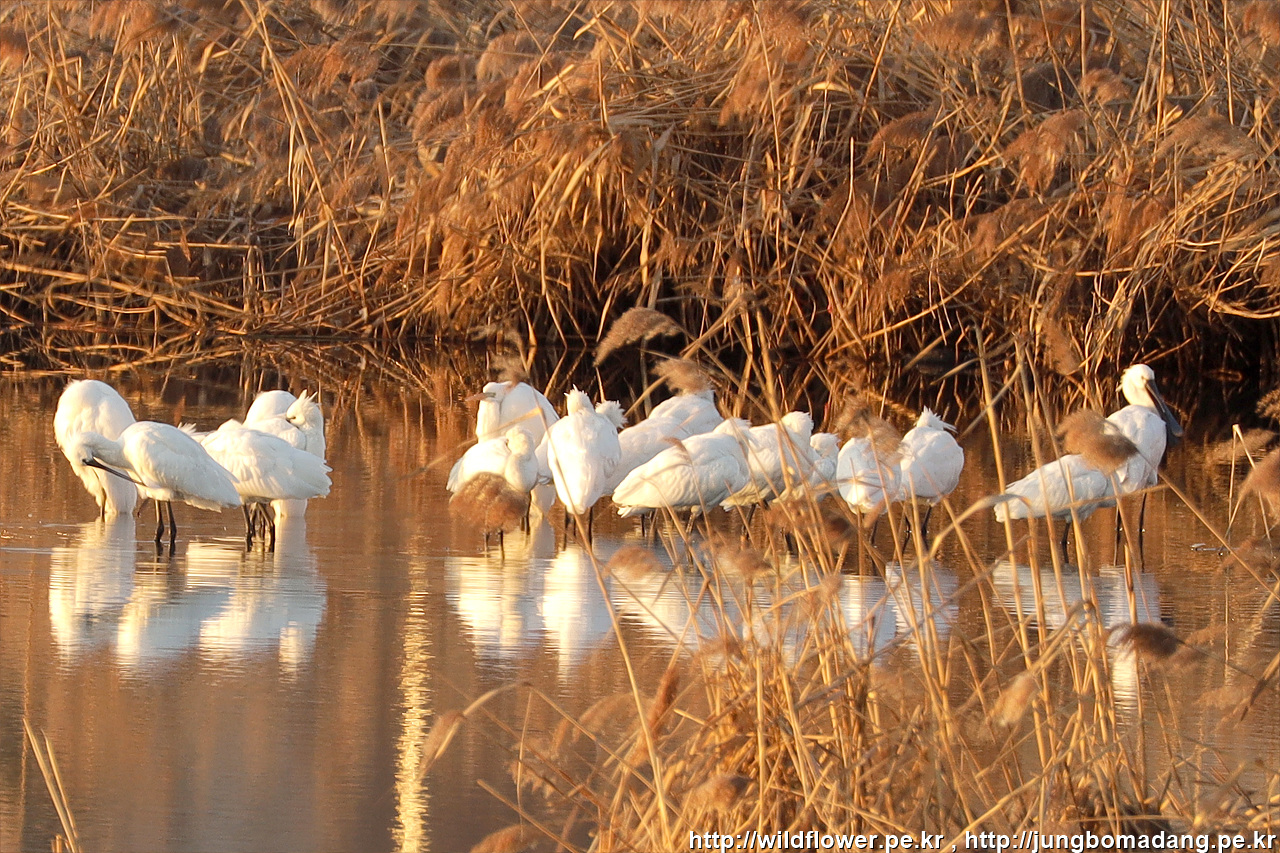 저어새 무리 - 갈대숲에 모여 있네요. 겨울에는 없는 줄 알았는 데, 사진으로 담을 떄는 백로인가 했는 데, 사진 정리를 하다 보니 저어새임을 확인 했습니다. 저어새는 멸종위기종 1급입니다. 크롭 사진입니다.