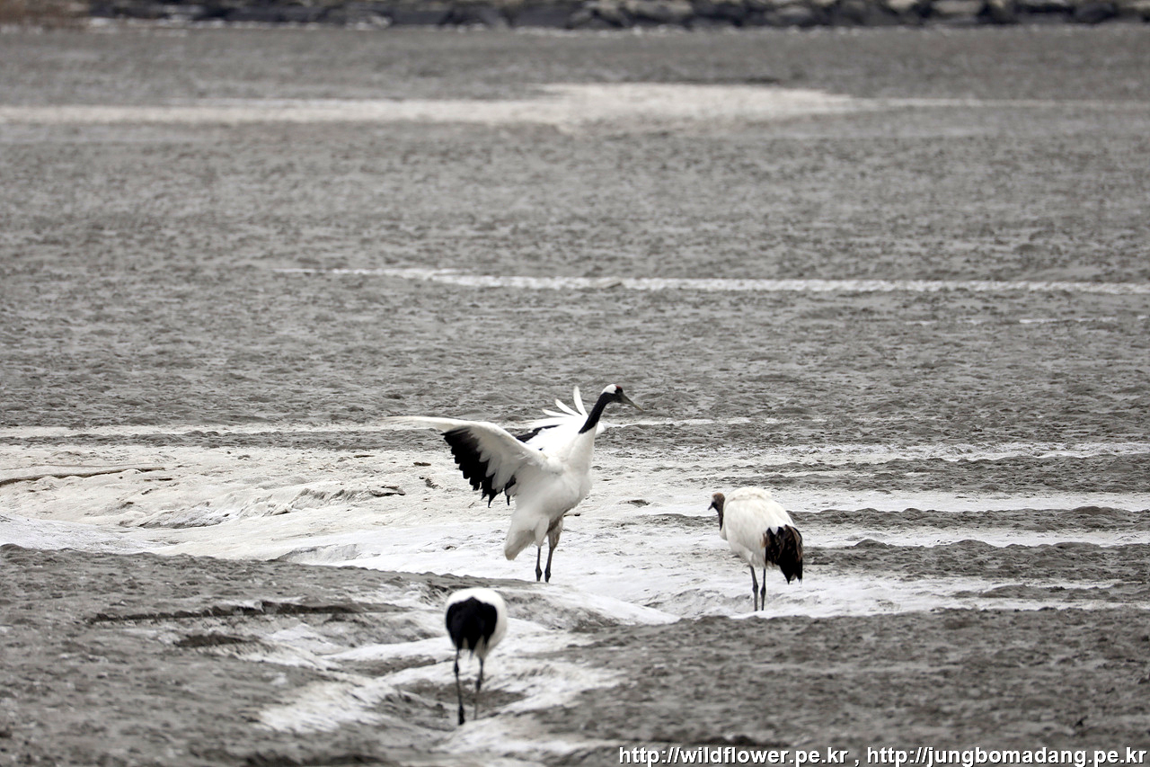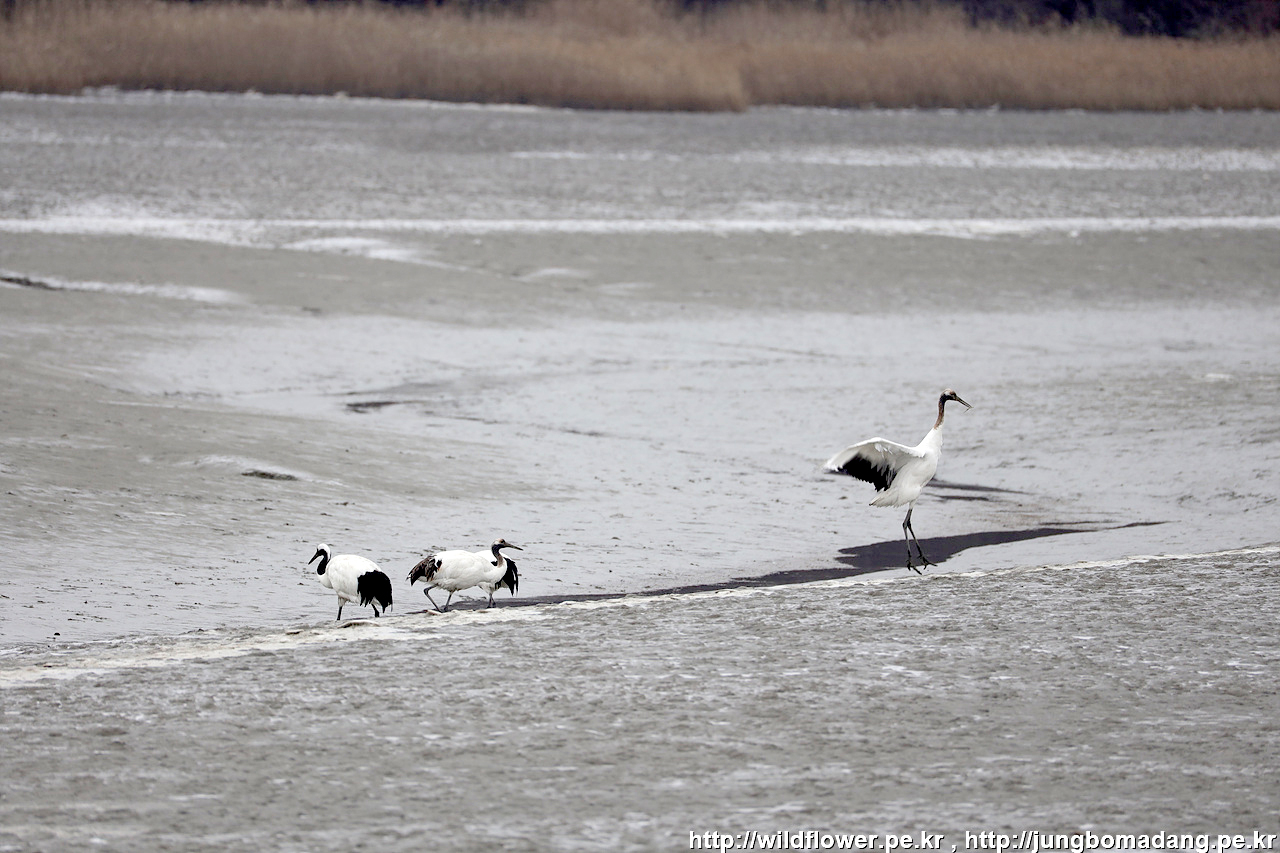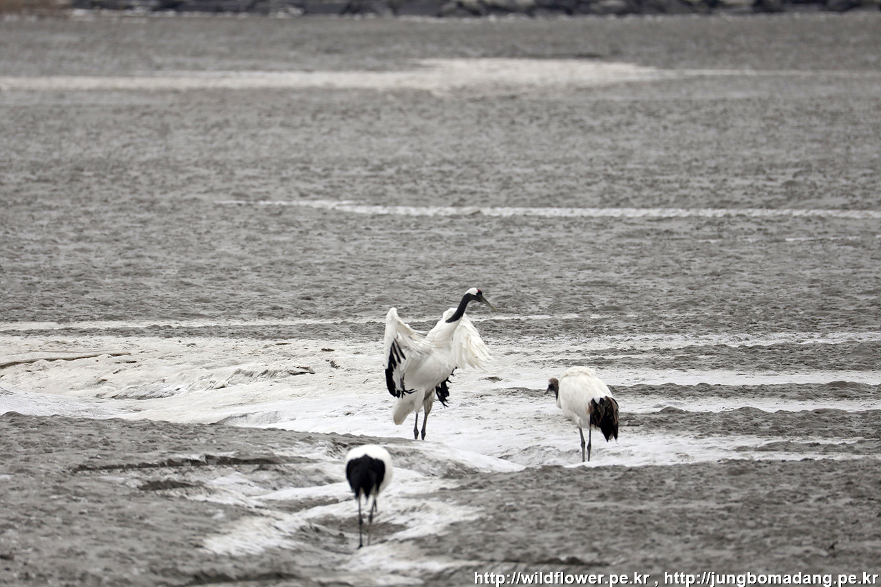 두루미 가족 중 성조 한마리가 멀리 떨어져 있는 새끼를 부르는 듯한 느낌입니다.