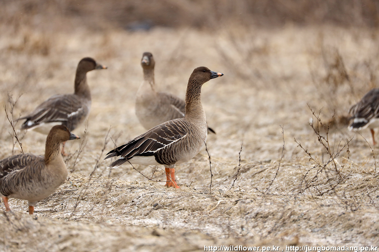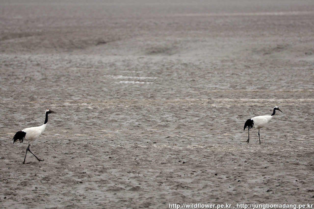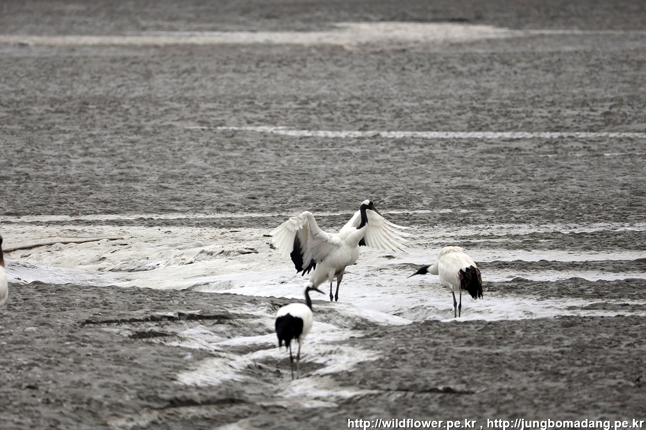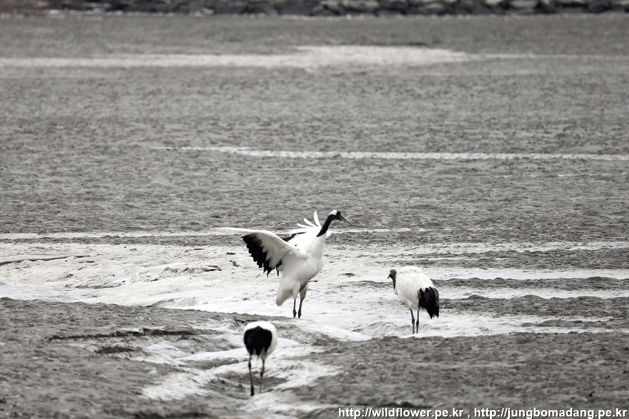 두루미 가족 중 성조 한마리가 멀리 떨어져 있는 새끼를 부르는 듯한 느낌입니다.