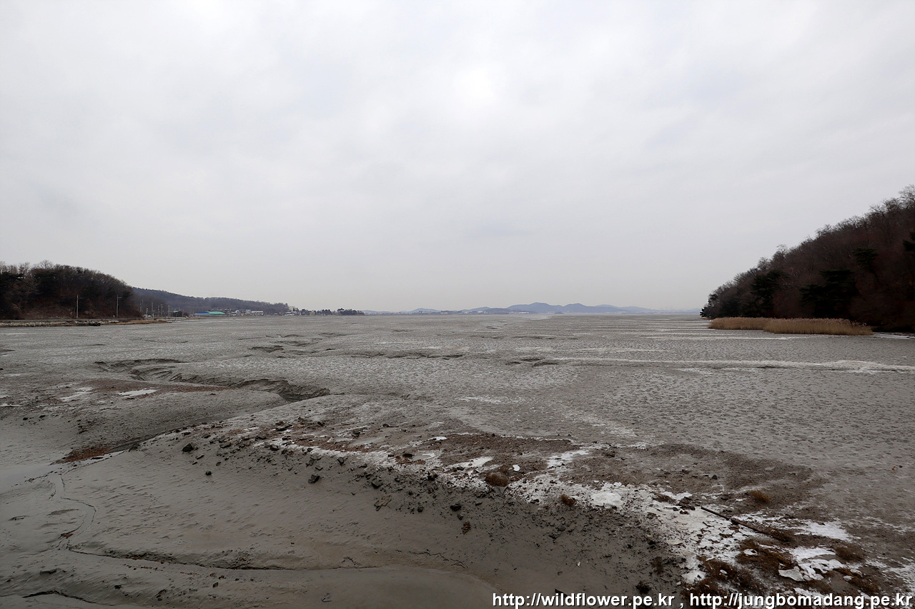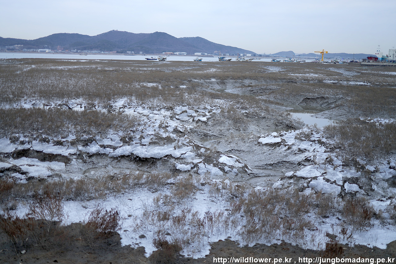 갯벌에 살얼음이 덮여 있습니다. 추운 겨울임을 실감하는 순간이죠.