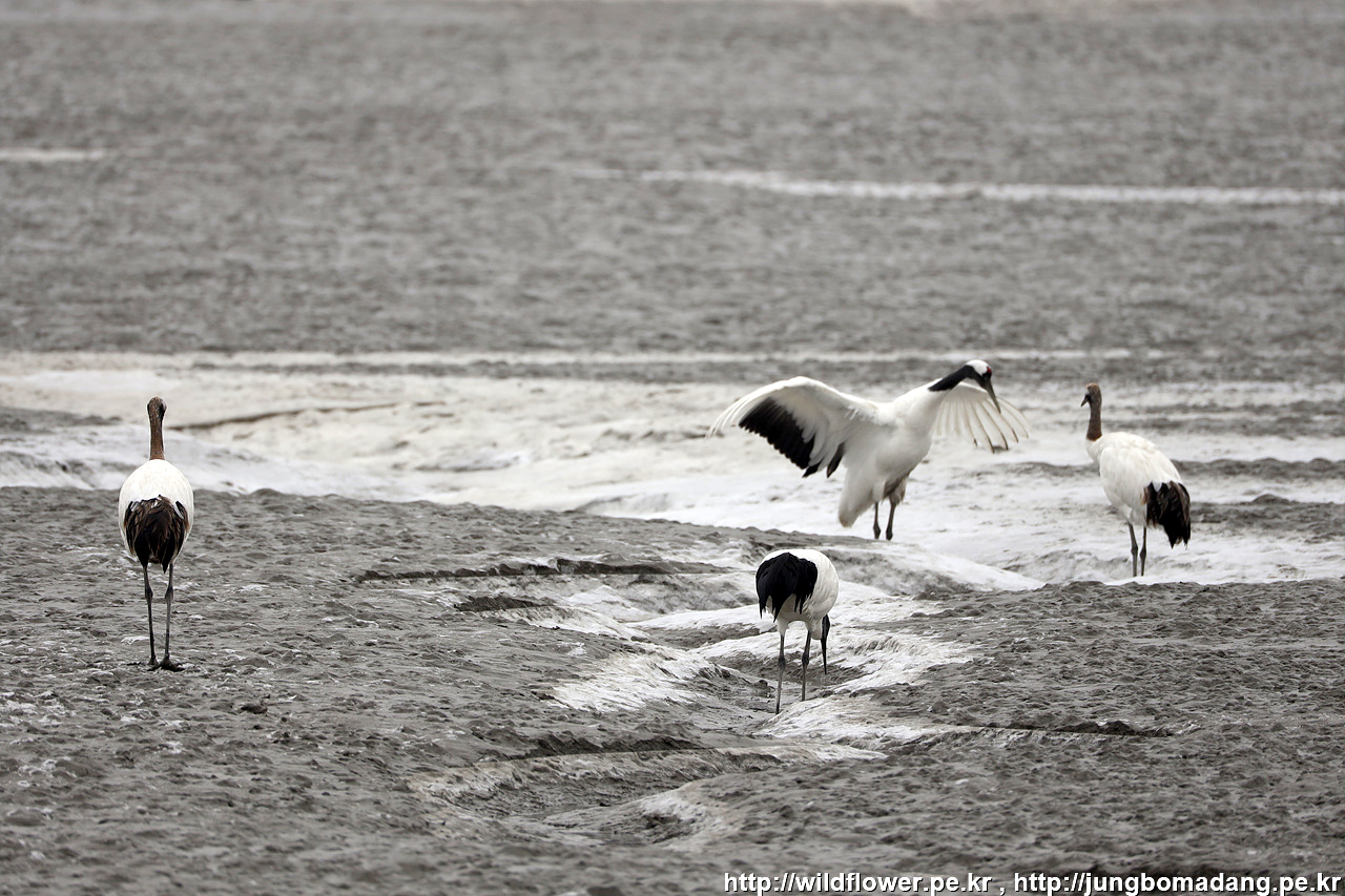 두루미 가족 - 어린새, 성조, 성조, 어린새. 성조 두루미 한마리가 날개짓을 시작합니다.