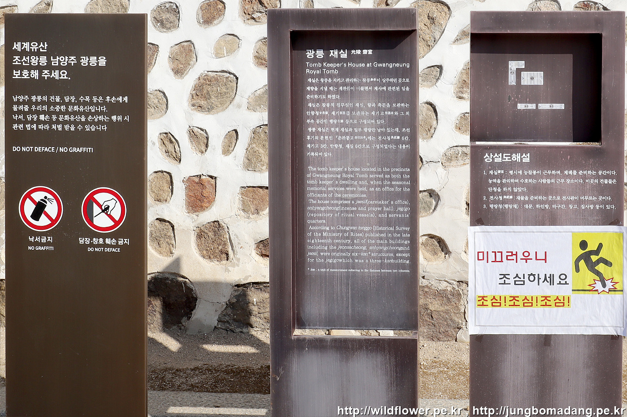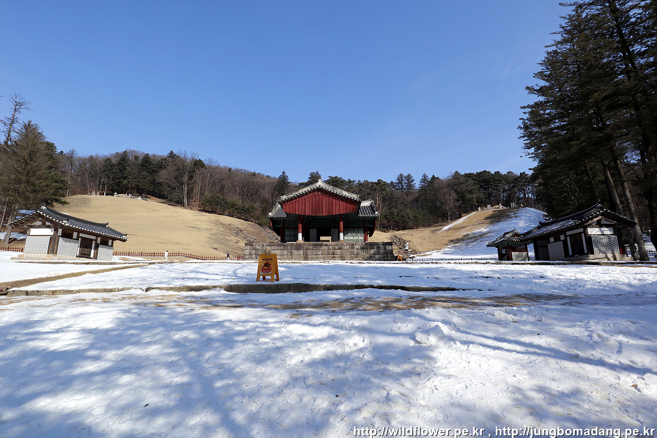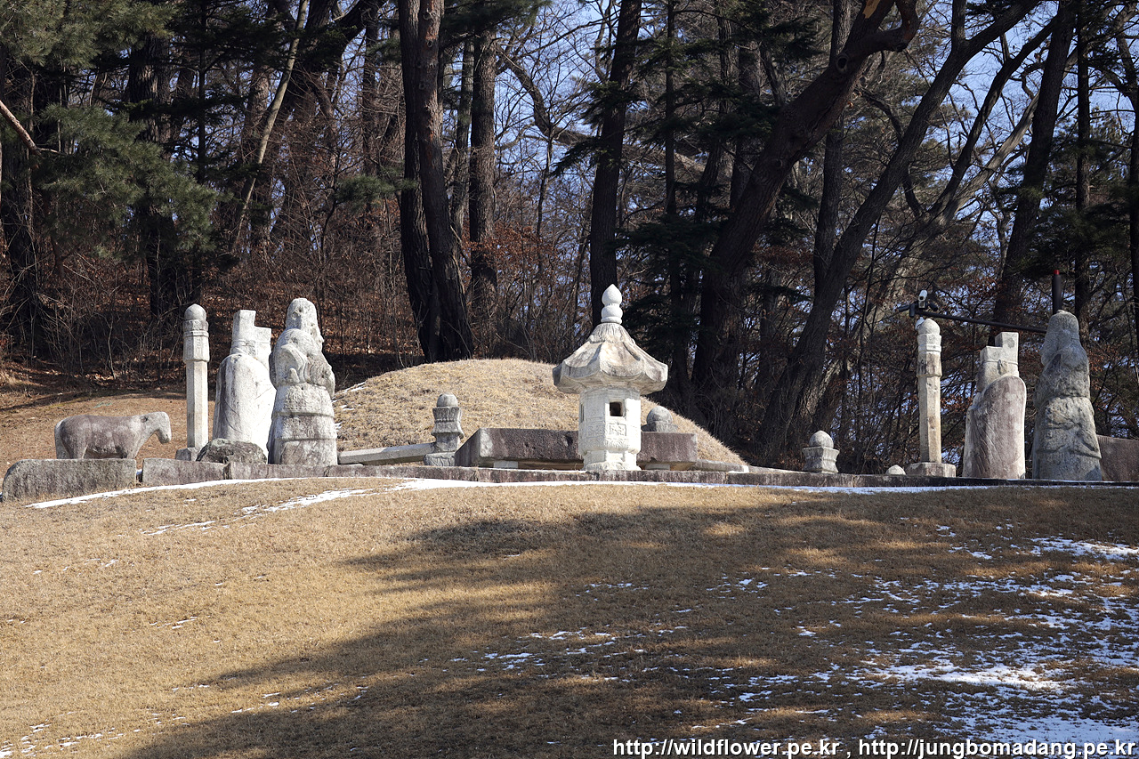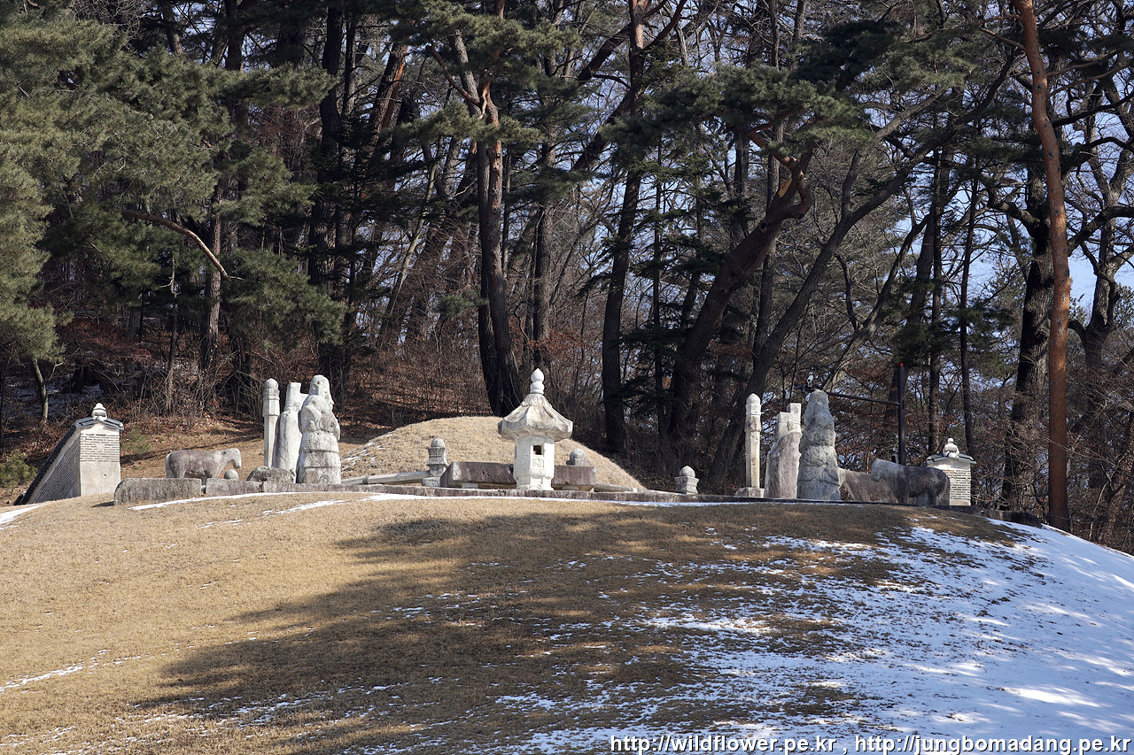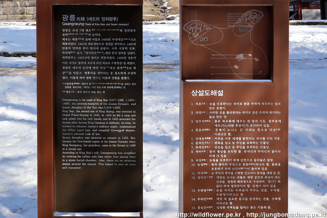 좌측이 세조의 능이고, 우측이 정희왕후의 능입니다. 가운데 정자각이 있고, 왼편에 수라간, 오른편 뒷쪽은 비각, 앞쪽은 수복방입니다.
