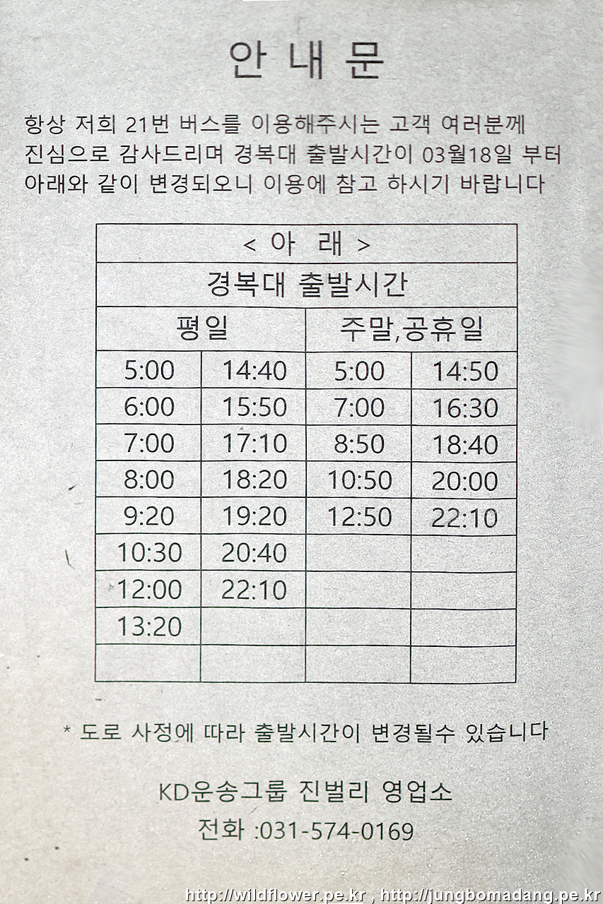 남양주 21번 버스 시간표 - 2024년 3월 18일 기준 시간표로 일부 버스가 운행하지 않을 수 있으니 버스 이용 전 가급적 진벌리 영업소(031-574-0169)에 사전 문의 바랍니다.