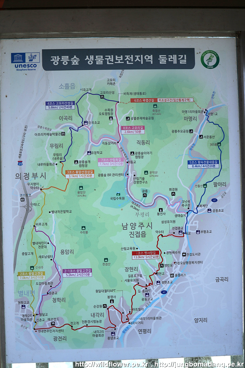 광릉숲 생물권보전지역 둘레길 - 날씨가 괜찮아 지면 한번 걸어봐야 겠네요. 풀코스가 45Km이므로 한번에 돌긴 어렵지 싶고 개인적으로 두번 정도 나눠서 걸으면 되겠습니다.