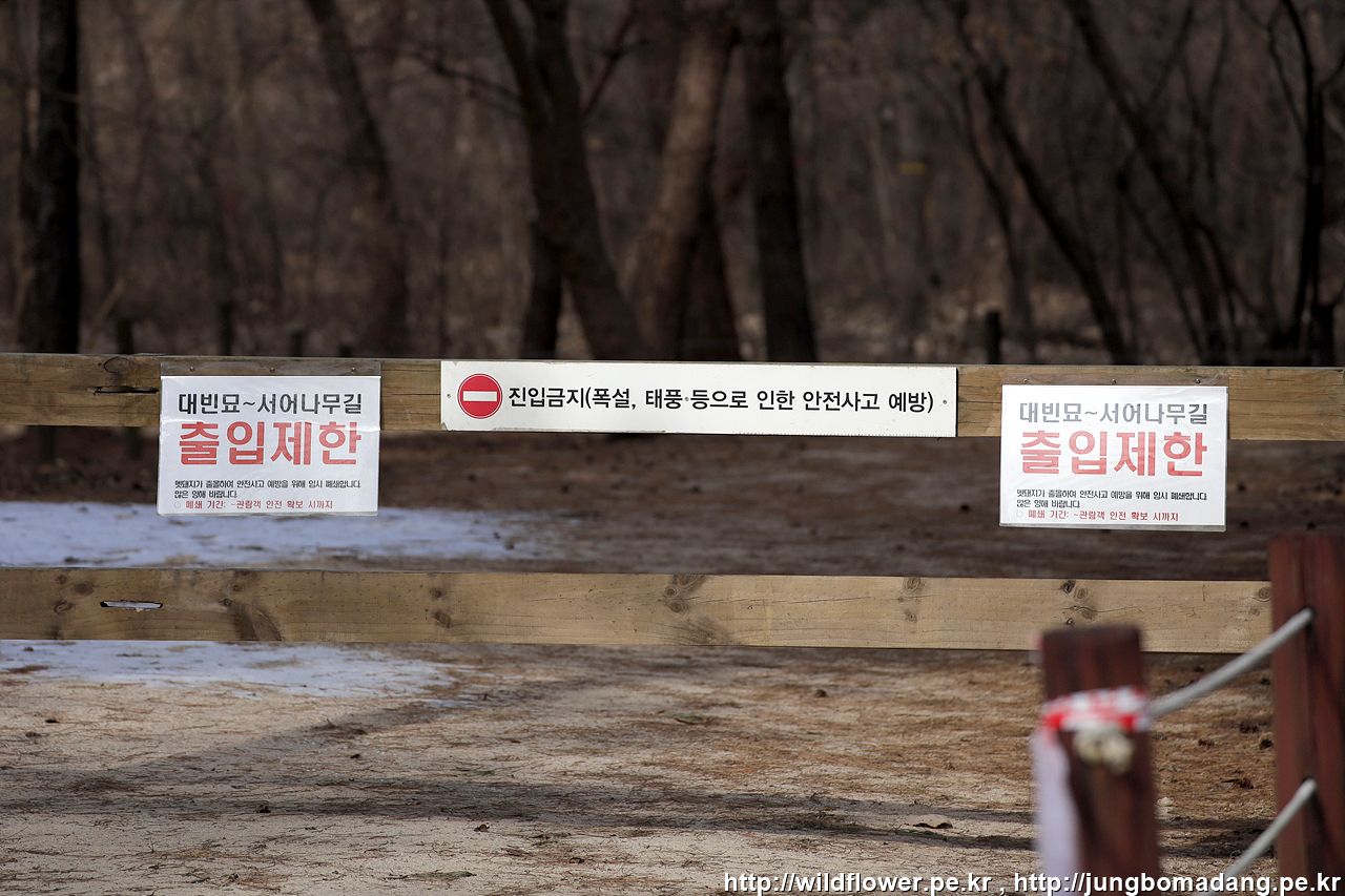 * 현재 일부 구간(서어나무길,소나무길)은 현재 통제입니다. 아마 결빙 구간이거나 멧돼지와의 반가운 조우를 방지하기 위함인 듯 합니다.
