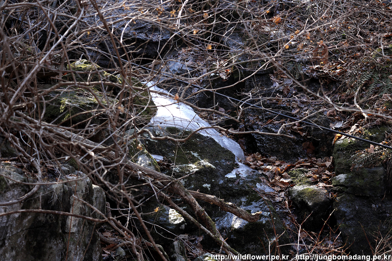 처녀치마를 보고 있는 데, 계곡에 풍덩~ 누가 돌을 던졌나? 근데 뭔가 시커먼 게 날라갑니다.