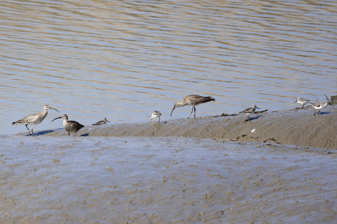 길을 걷고 있는 데 탐조를 하는 것으로 보이는 차량이 제 옆에 멈춰서 이런 저런 이야기를 하다 얼마 가지 않아 멈춰 있네요. 그곳에는 물이 드러난 갯벌에 도요 무리들이 먹이사냥을 하고 있습니다.