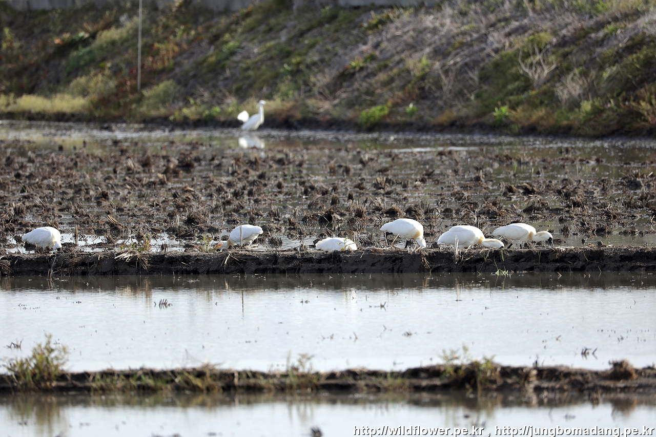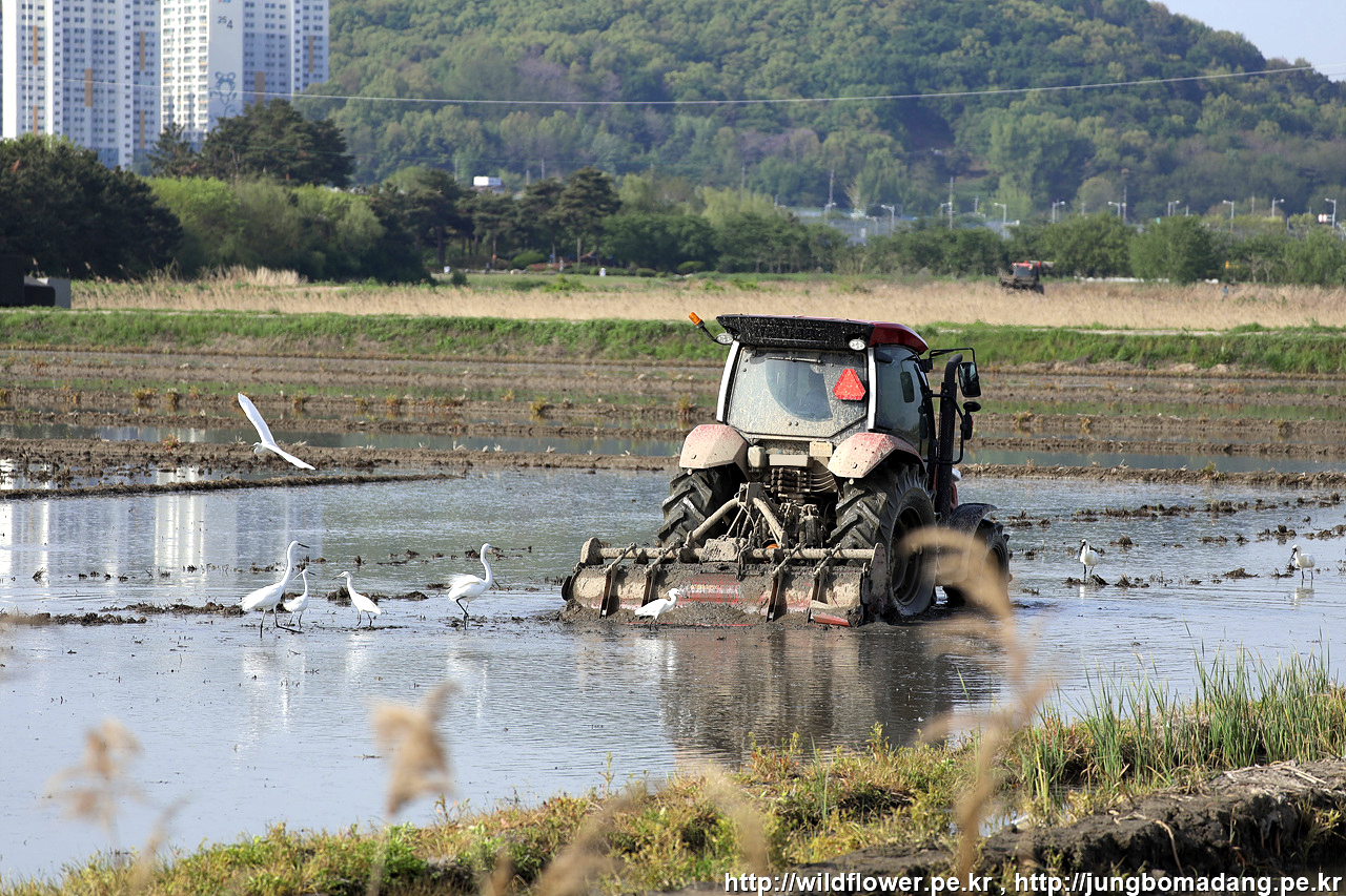 5월 모내기 준비를 하는 논에서 백로들과 저어새가 트랙터의 밭갈이 뒤 뒤집어진 곳에서 먹이사냥을 하고 있네요.