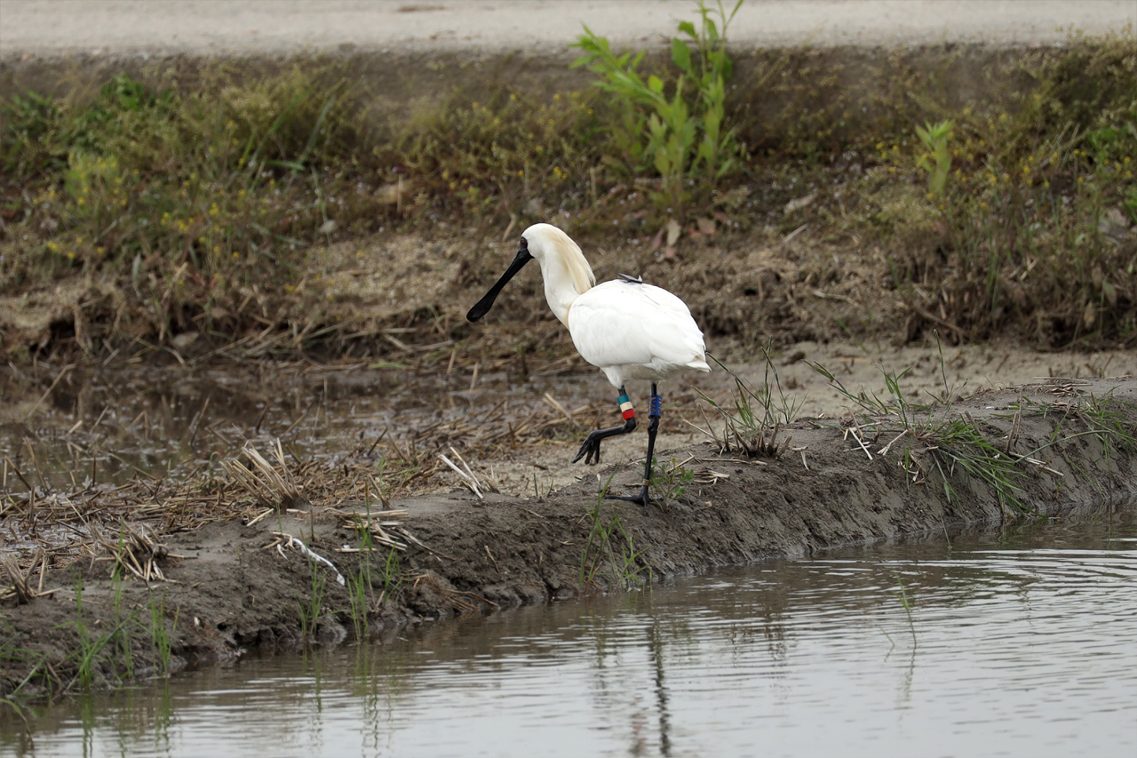 저어새 - 다리와 등에 표식이 달려 있네요. 아시다시피 저어새는 멸종위기 동물 1급으로 지정되어 있어 관리가 필요합니다.