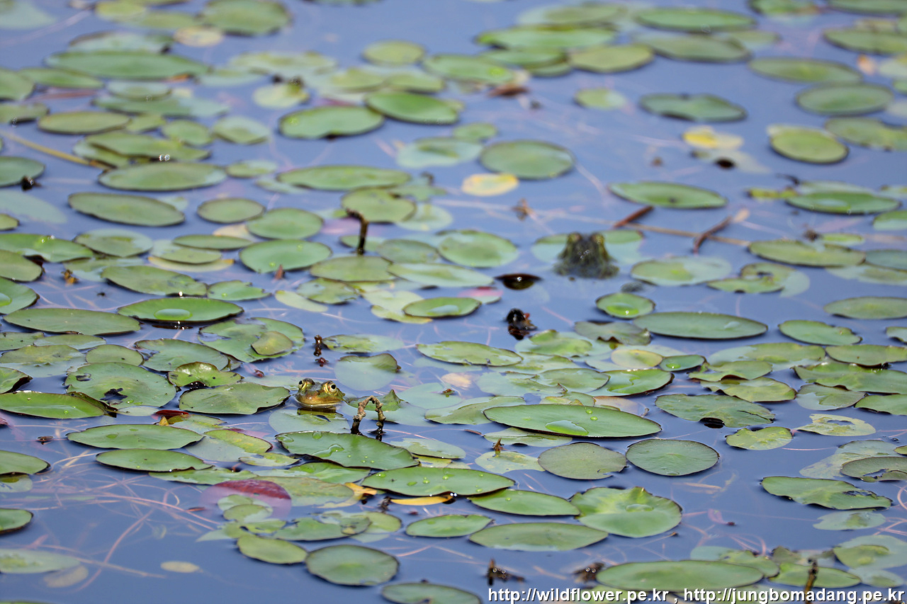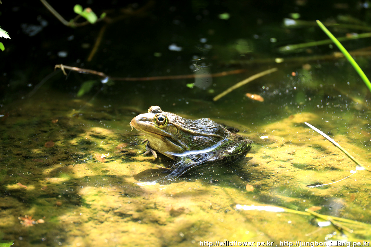 개구리가 고개를 빼꼼히 내밀고 있습니다.