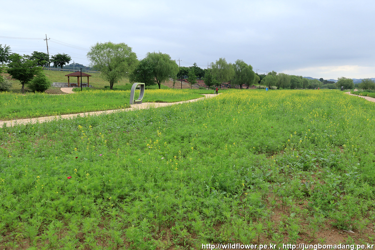 강매석교공원 - 유채, 코스모스 개화 상황은 보시다시피 이렇습니다. 5월 16~17일에 유채꽃 축제가 있었다는 데 유채는 그럼 많이 사라진 듯 보이고, 코스모스 싹은 많이 보여서 1~2주 뒤면 코스모스가 필 것 같습니다.