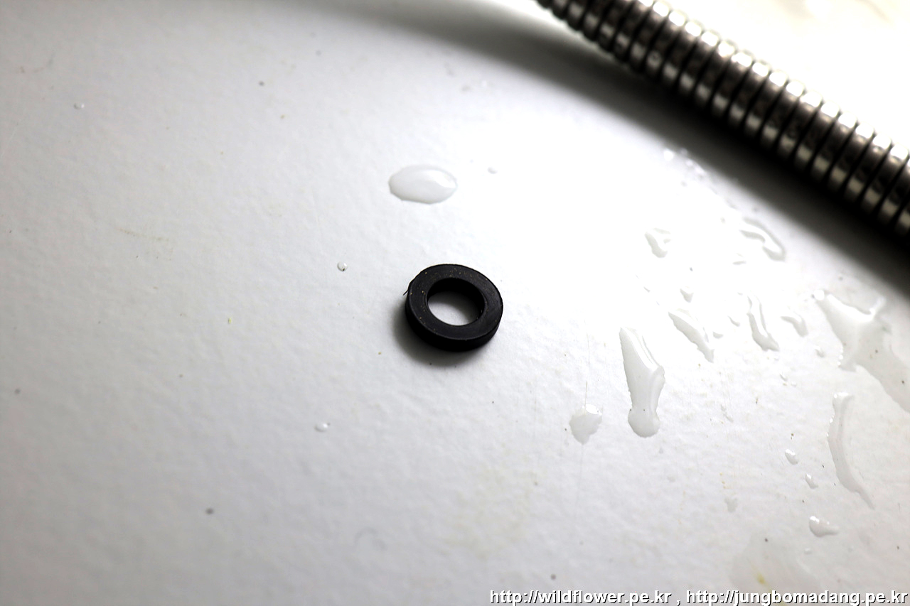 토수관 너트에 이렇게 검은색 고무 패킹이 들어 있는 데 잘 빠집니다. 설치 시 토수관과 토수 연결 호스 연결시 반드시 이 고무 패킹이 사이에 들어가야하므로 잊어 버리지 않게 보이는 데 잘 둡니다.
