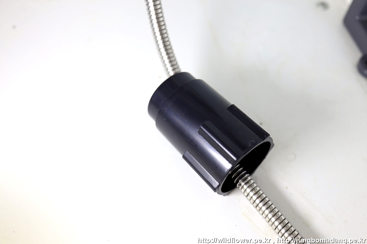 평형추를 토수 연결 호스에 장착하는 데, 아래에서 1/3 정도의 지점에 장착합니다. 아래 그림을 보다 시피 토수관 너트 있는 쪽이 아닌, 수전헤드쪽 호스 위치 입니다.