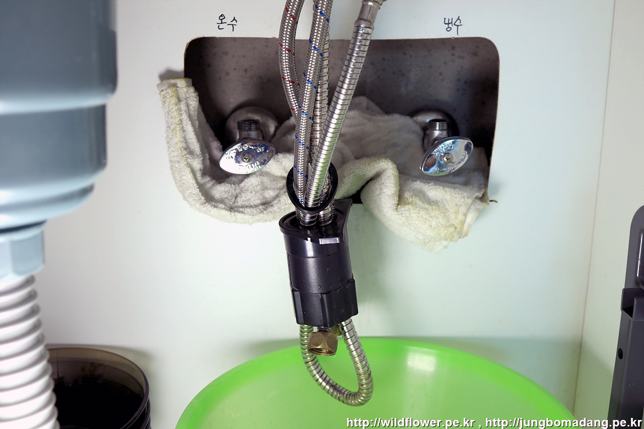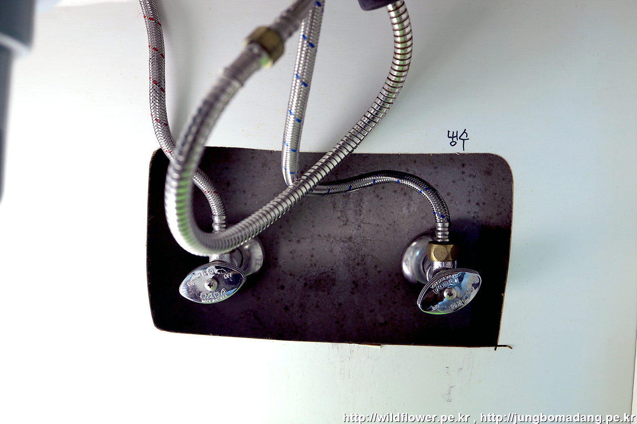 마지막으로, 온수, 냉수 고압 호스를 체결해 주면 됩니다.