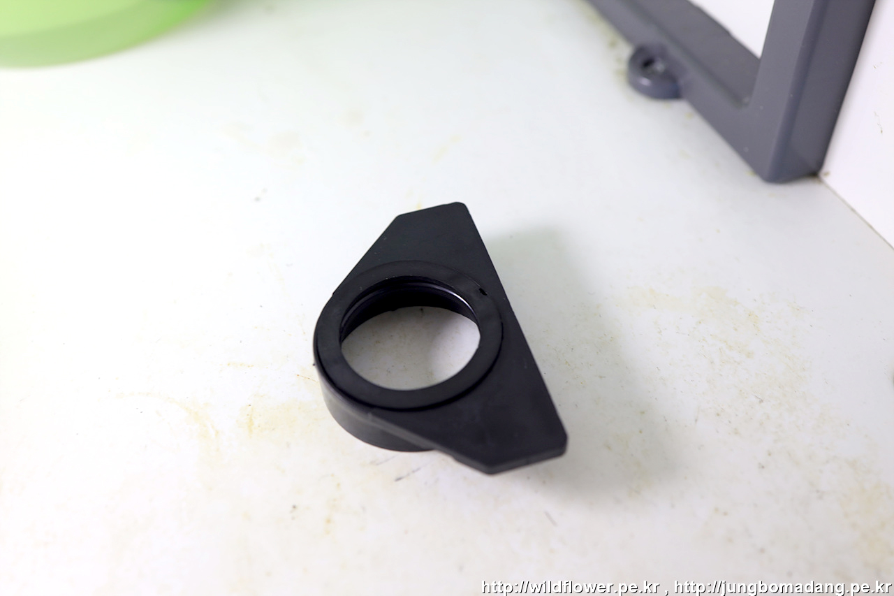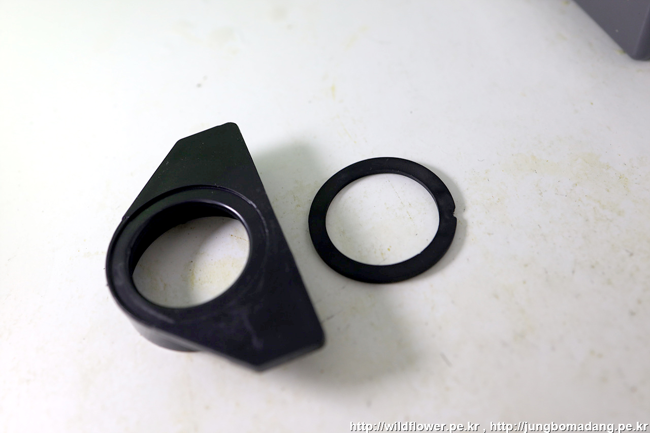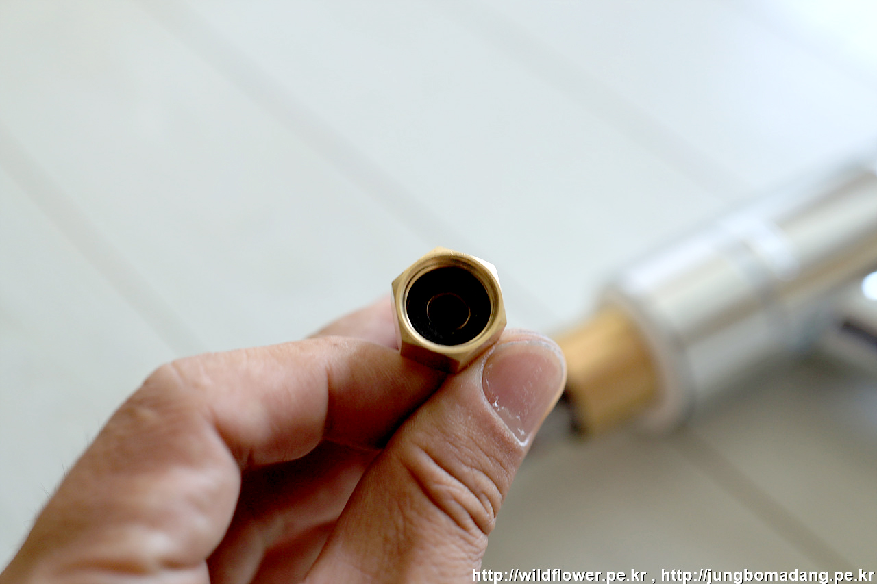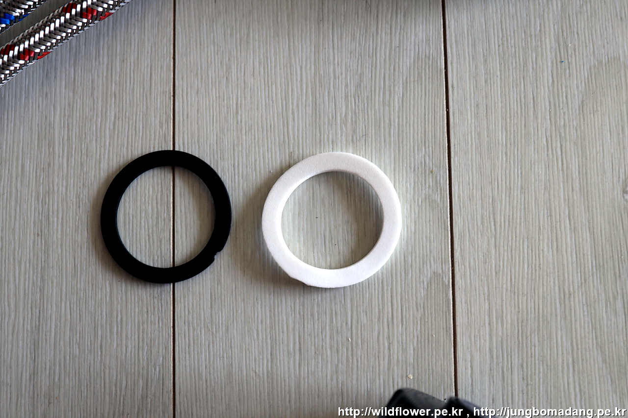토수관 너트에 이렇게 검은색 고무 패킹이 들어 있는 데 잘 빠집니다. 설치 시 토수관과 토수 연결 호스 연결시 반드시 이 고무 패킹이 사이에 들어가야하므로 잊어 버리지 않게 보이는 데 잘 둡니다.
