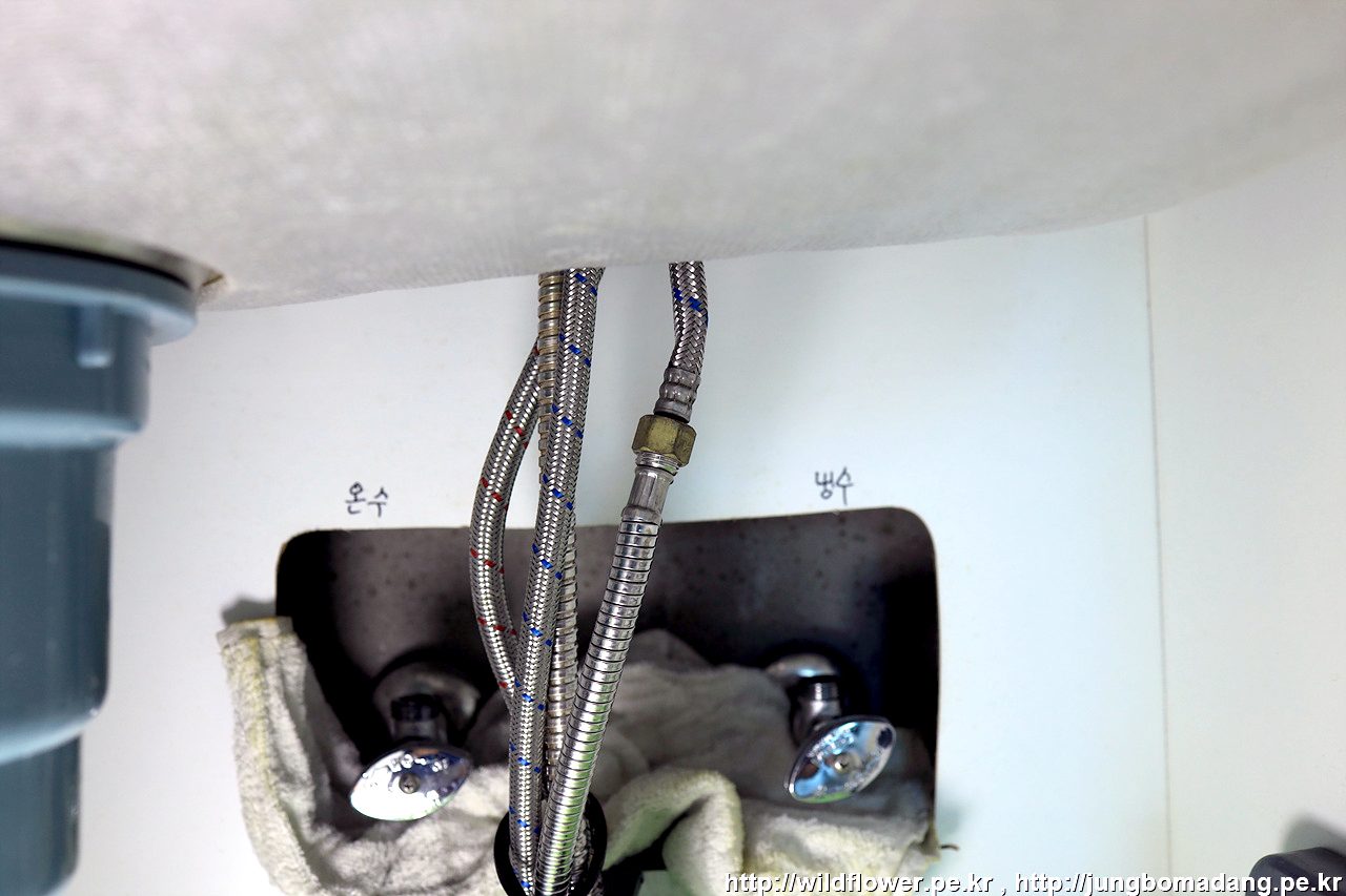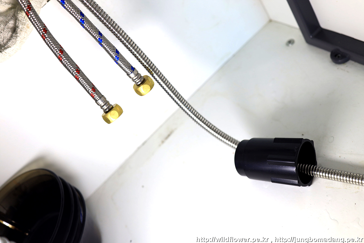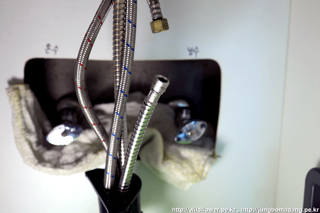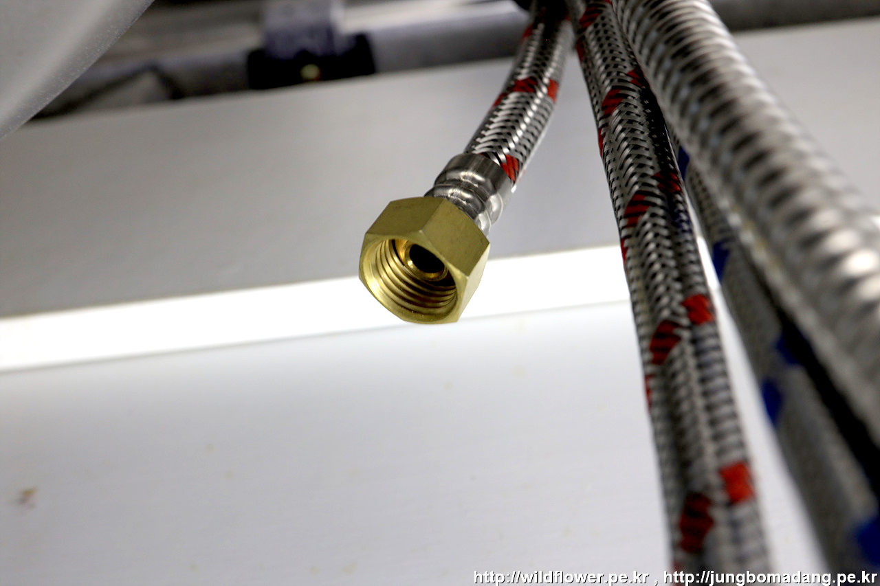 마지막으로, 온수, 냉수 고압 호스를 체결해 주면 됩니다.