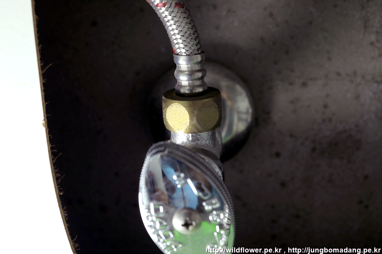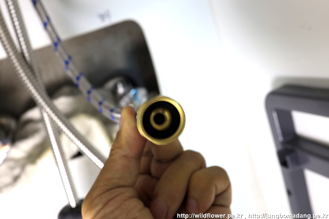 냉수 고압 호스 체결하는 데 보다 시피 안에 검은색 고무 패킹이 있나 확인 후 체결합니다. 체결은 스패너로 시계방향(스패너 손잡이가 본인 몸쪽)으로 체결하면 되고, 너무 꽉 조이면 안되고 적당히 조입니다.