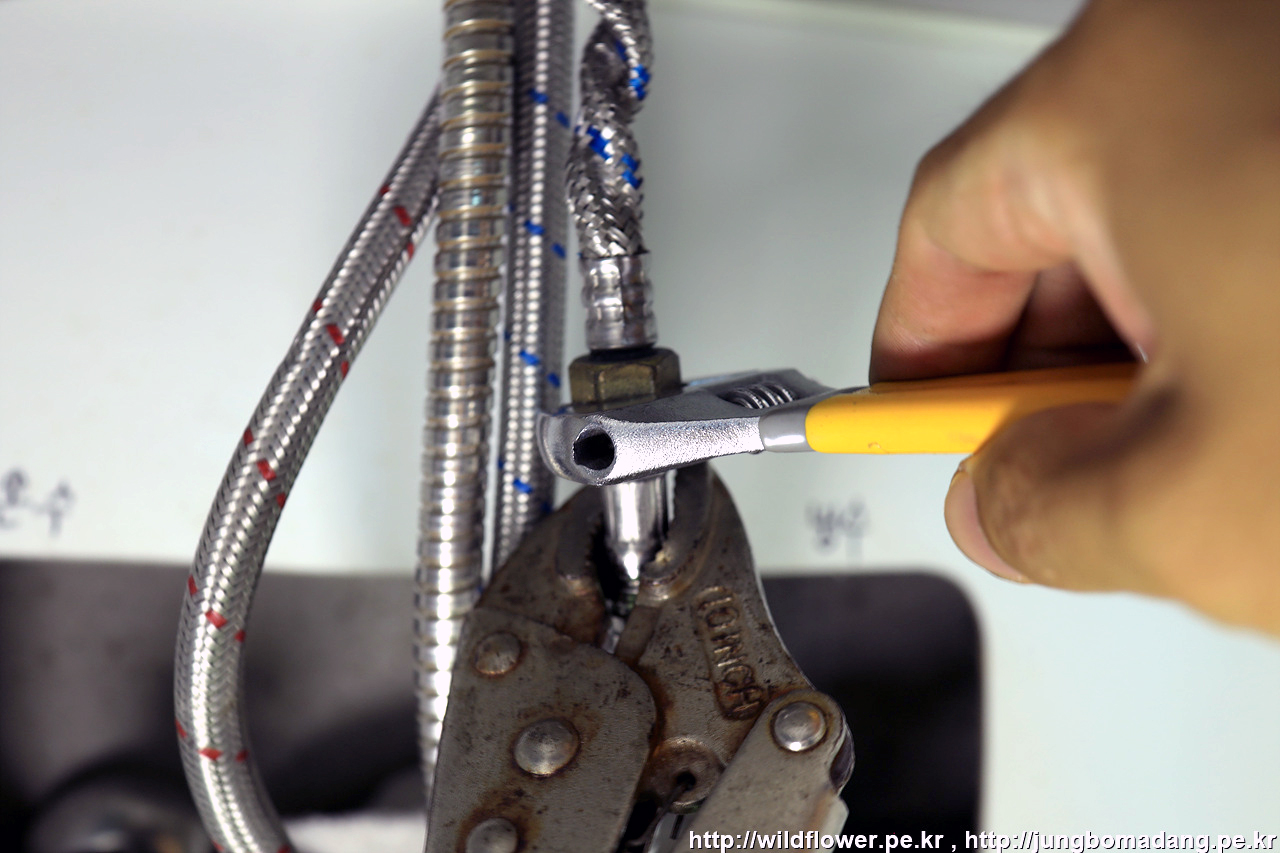 냉수, 온수 고압호스의 너트는 스패너를 통해 풀어 줍니다. 스패너를 이용해서 스패너 손잡이를 벽쪽으로 전진하면 풀립니다. 헐거워졌다 생각되면 손으로 돌려서 나머지 풀어 줍니다.