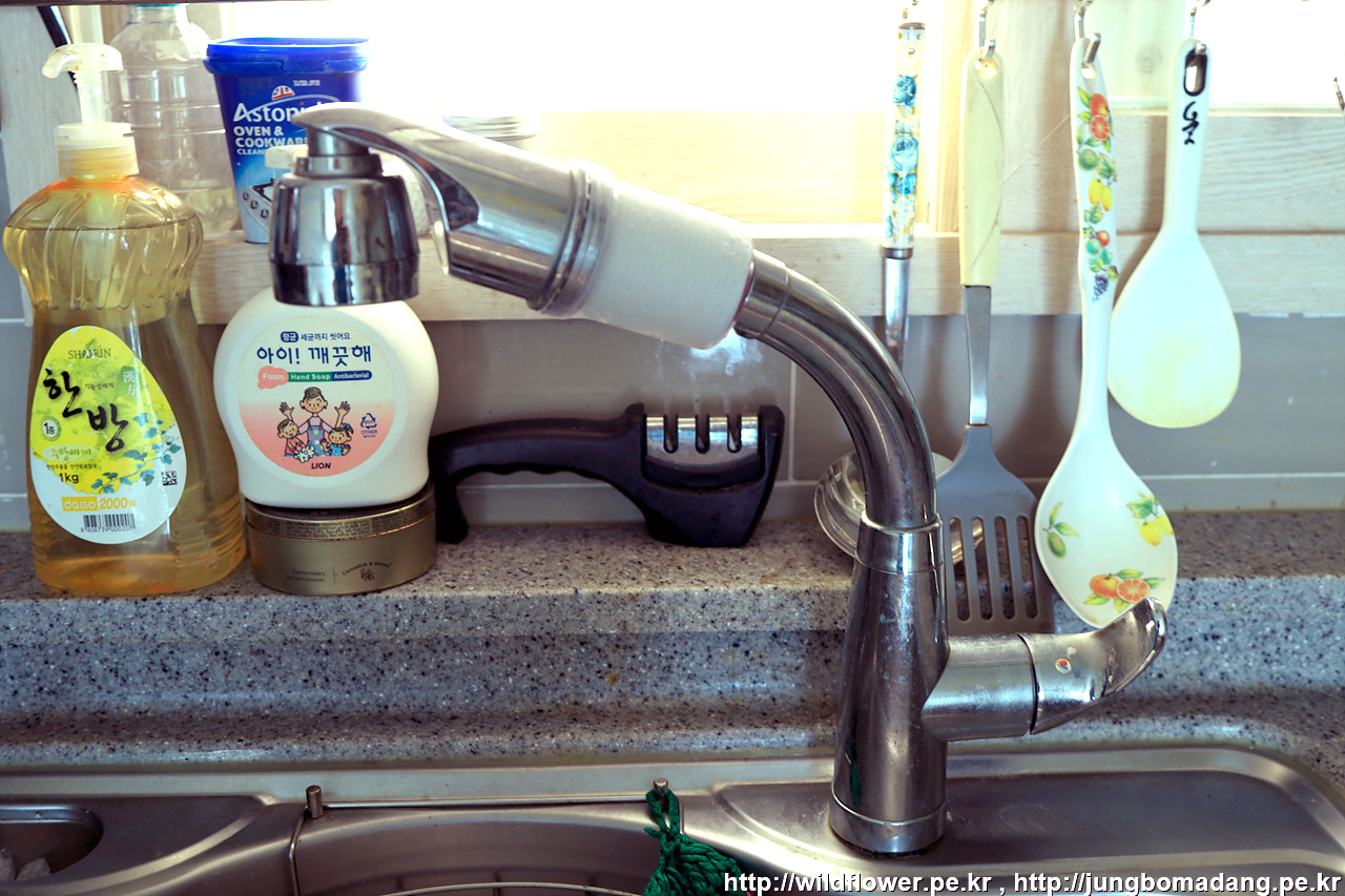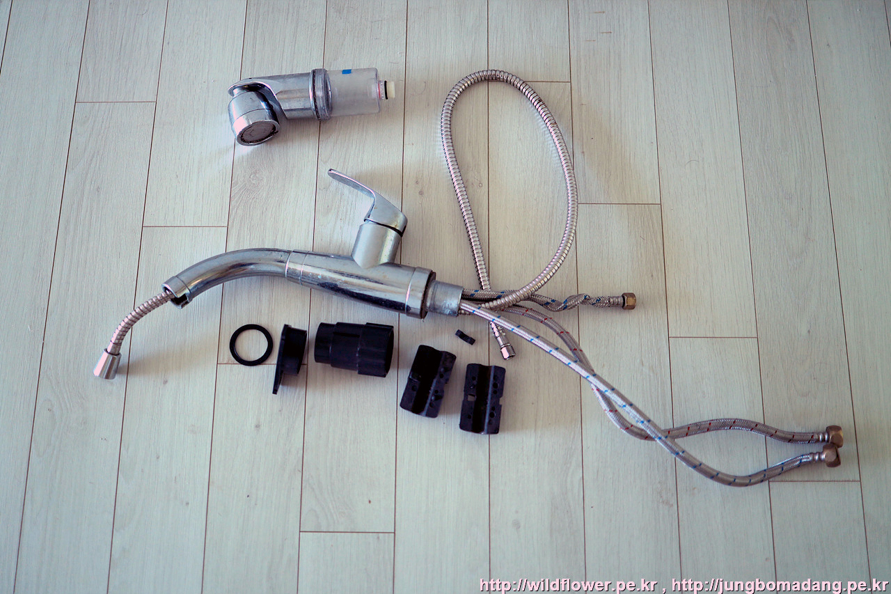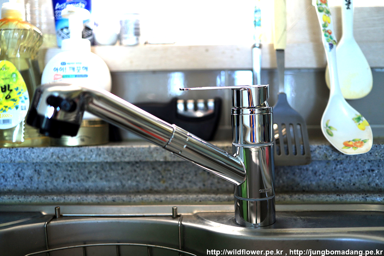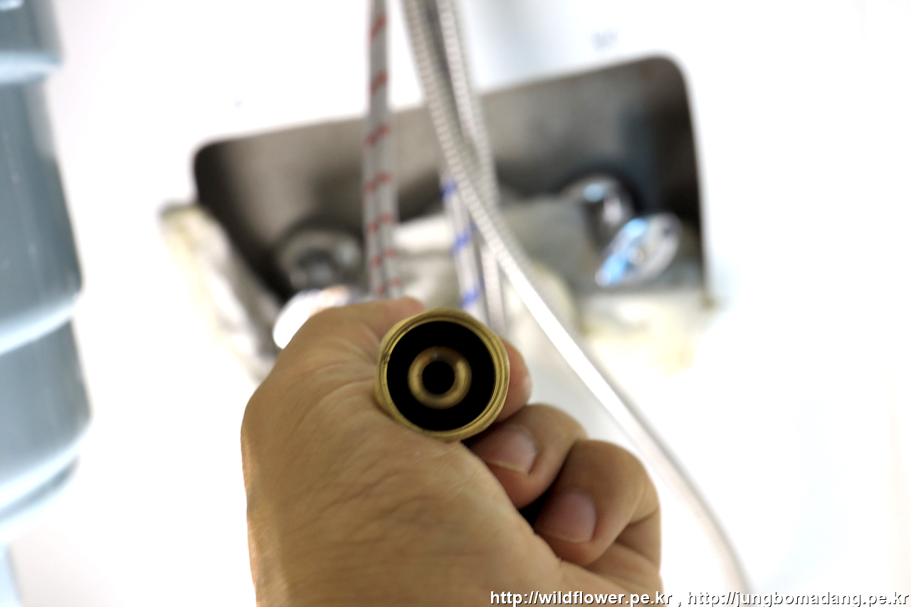 물을 틀어 보니 잘 나오네요. 수전 헤드는 기존것으로 교체했습니다. 왜냐면 정수필터가 새제품과 맞지 않아서 기존 것을 장착했습니다. 새 수전 헤드는 잘 보관했다가 나중에 이사가면 원위치 시켜야죠 ㅋㅋ