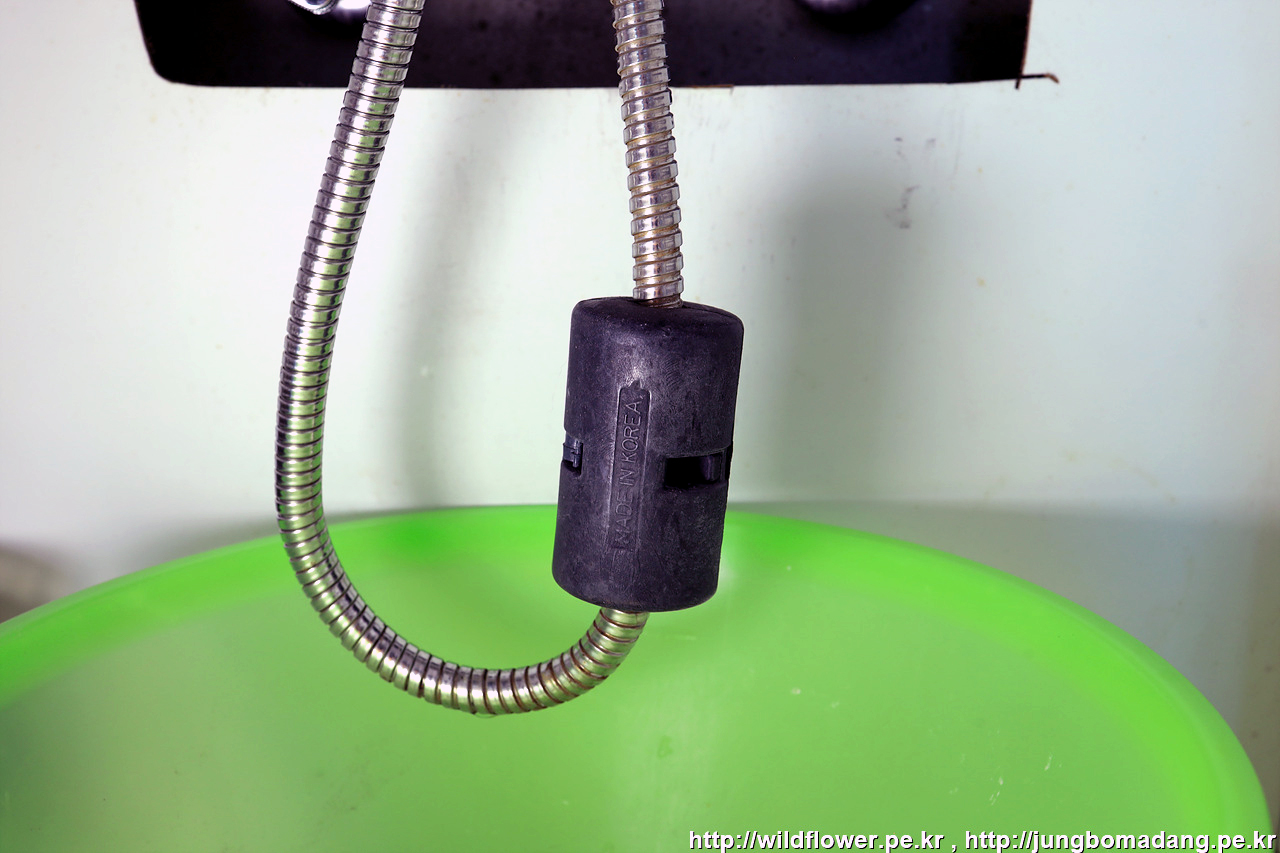 평형추를 토수 연결 호스에 장착하는 데, 아래에서 1/3 정도의 지점에 장착합니다. 아래 그림을 보다 시피 토수관 너트 있는 쪽이 아닌, 수전헤드쪽 호스 위치 입니다.