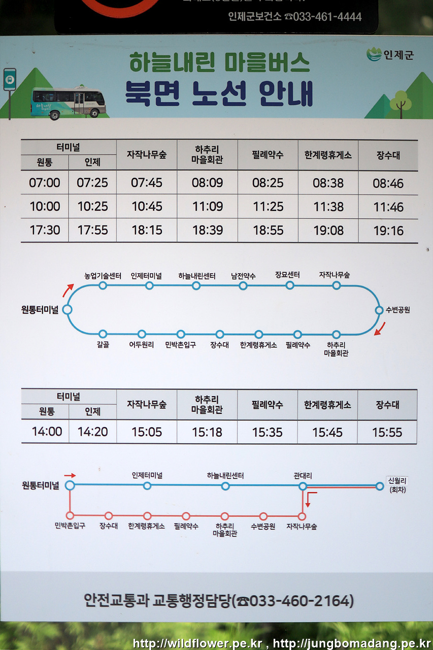 하늘내린 마을버스 시간표. 카카오버스를 참고하여 위에 시간표는 원통-01, 아래 시간표는 원통-02로 운행됩니다.