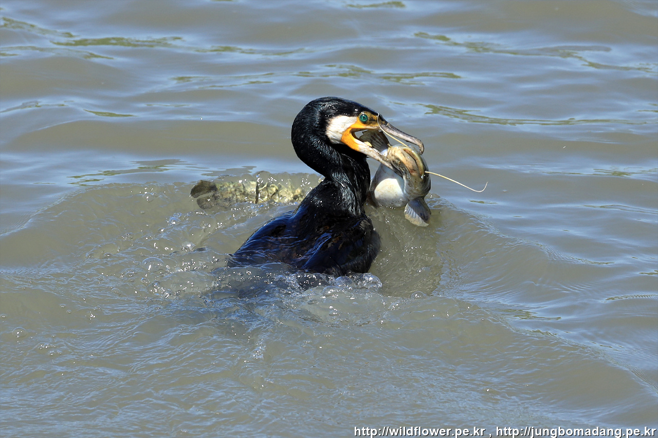 민물가마우지 - 크롭 사진입니다. 메기 한마리 잡아서 먹으려고 하는 데 너무 커서 어찌할 바를 모르는 모습이네요.