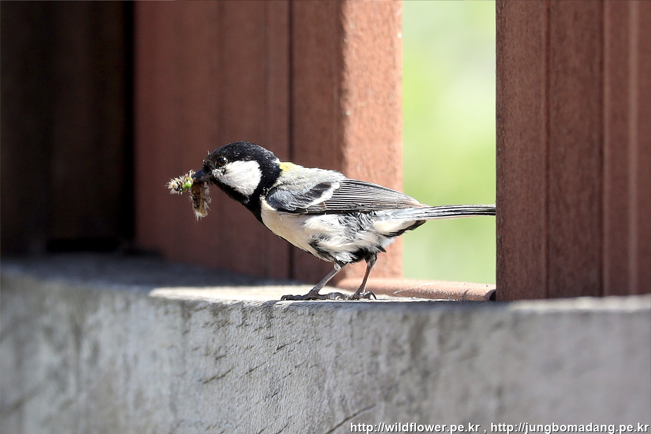 박새 - 탐조대 어딘가에 있는 둥지의 어린새들에개 먹이를 열심히 나르고 있습니다.