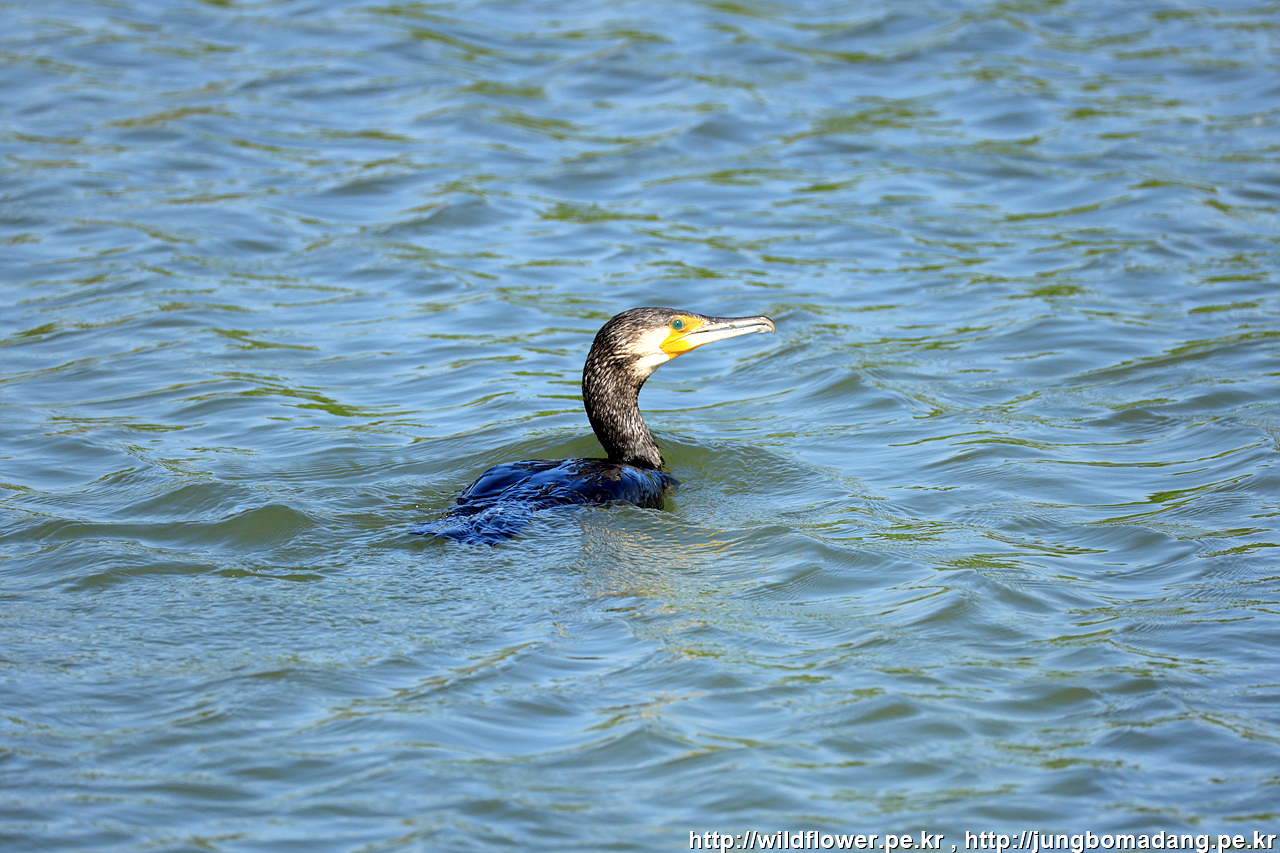 민물가마우지 - 크롭 사진입니다. 메기 한마리 잡아서 먹으려고 하는 데 너무 커서 어찌할 바를 모르는 모습이네요.