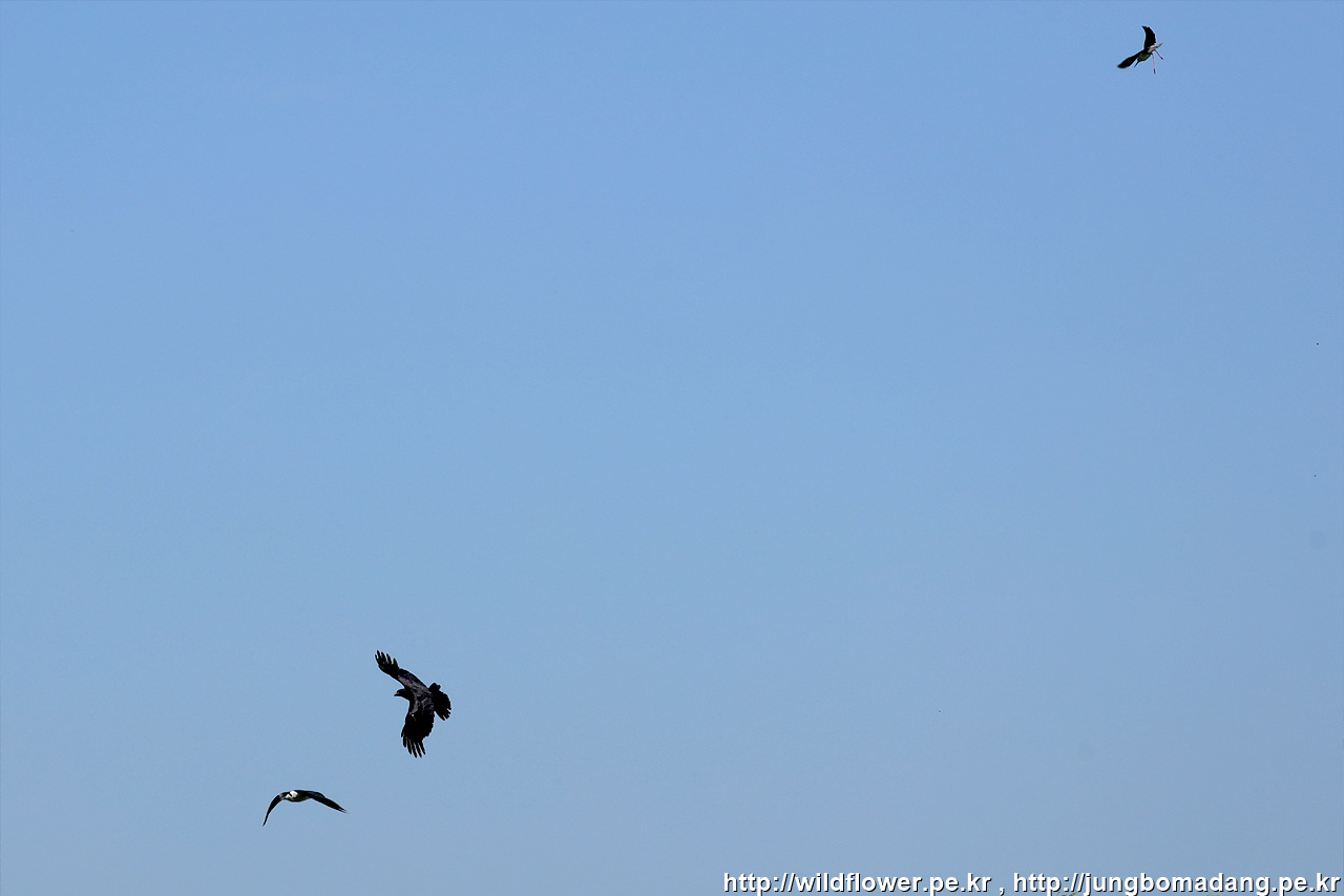 장다리물떼새 암수가 까마귀와 하늘에서 싸우고 있습니다. 아마도 까마귀가 장다리물떼새의 둥지를 노리는 것으로 보입니다. 까마귀보다 체급이 작지만 결국 까마귀를 물리치는 장다리물떼새 암수 승!