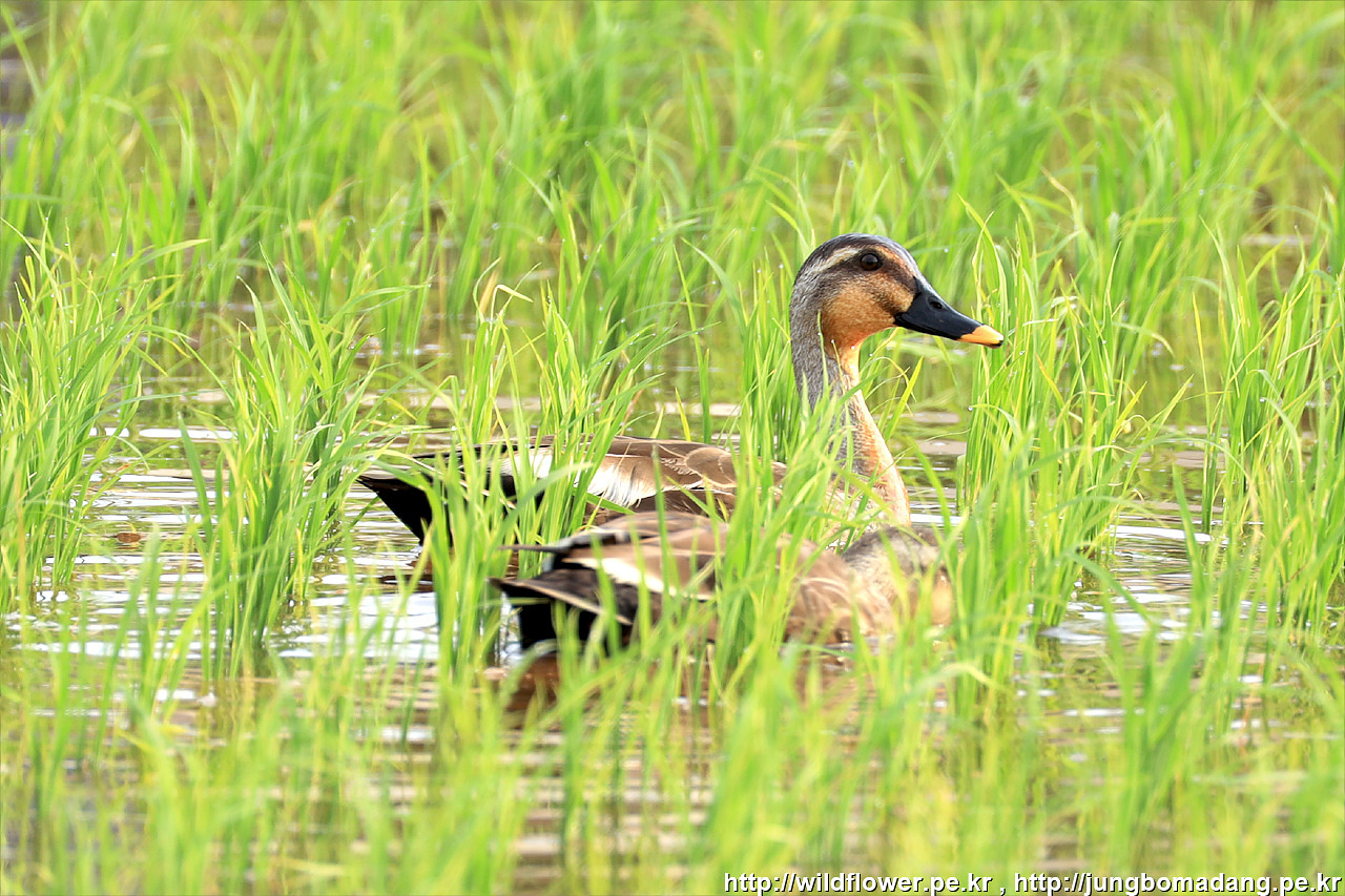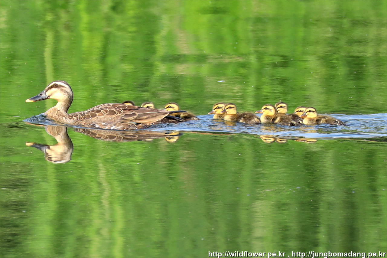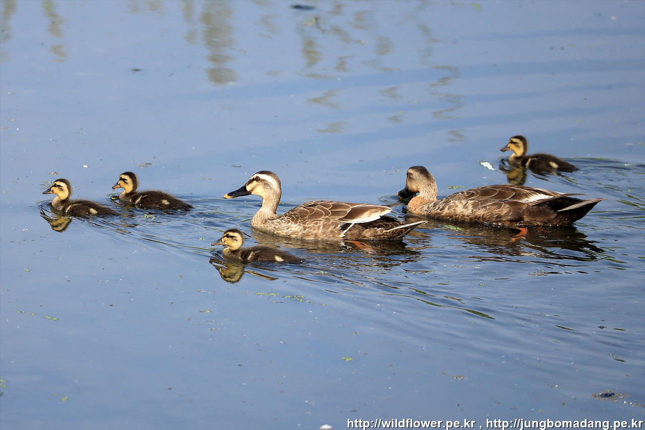 번식의 계절. 흰뺨검둥오리 가족들이 어린새를 달고 물에서 헤엄치며 이동하는 모습이 귀엽습니다.