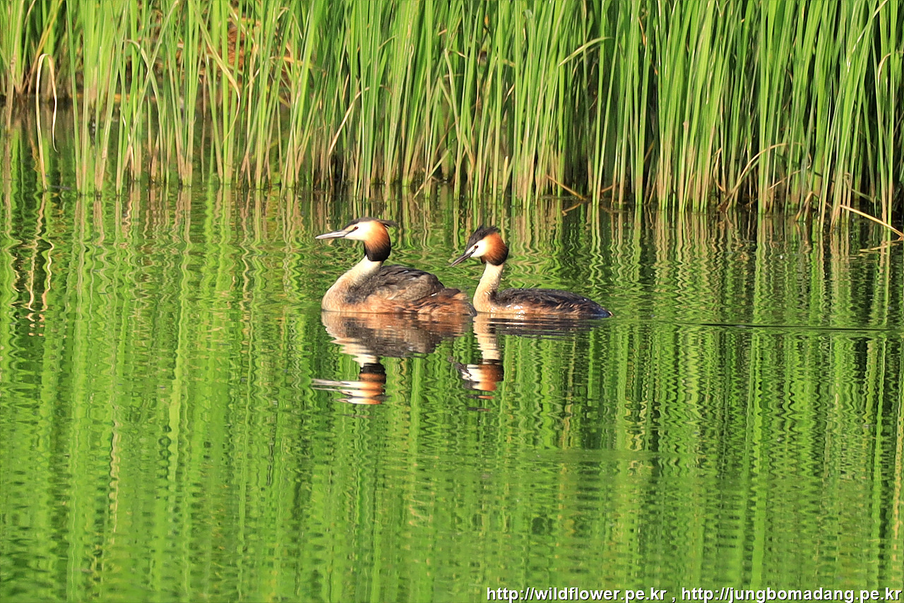 뿔논병아리 - 번식깃. 크롭 사진입니다. 뿔논병아리는 암수 구별이 쉽지 않다고 합니다. 다만 두마리가 있으니 암수가 아닐까 추측해 봅니다.