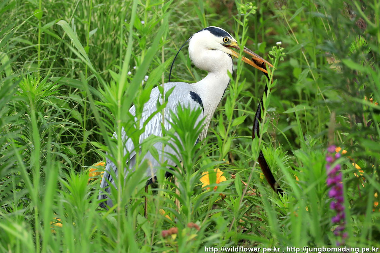 왜가리 - 크롭 사진입니다. 왜가리가 뭔가 길쭉한 것을 잡아서 먹으려고 시도중입니다. 뱀으로 추정됩니다.