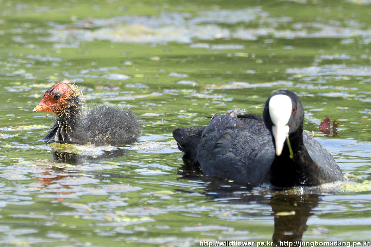 물닭 - 유조(어린새), 성조. 크롭 사진입니다. 유조는 태어난 지 얼마 안 된 것으로 보입니다.