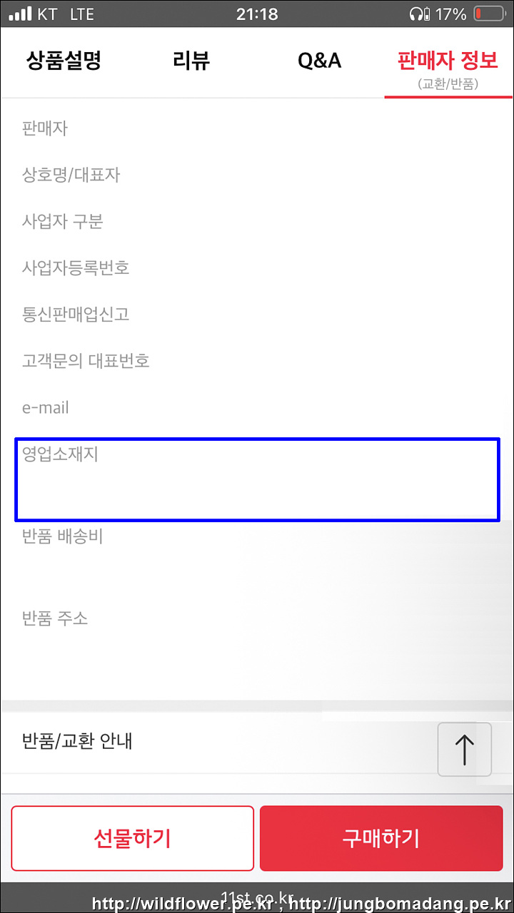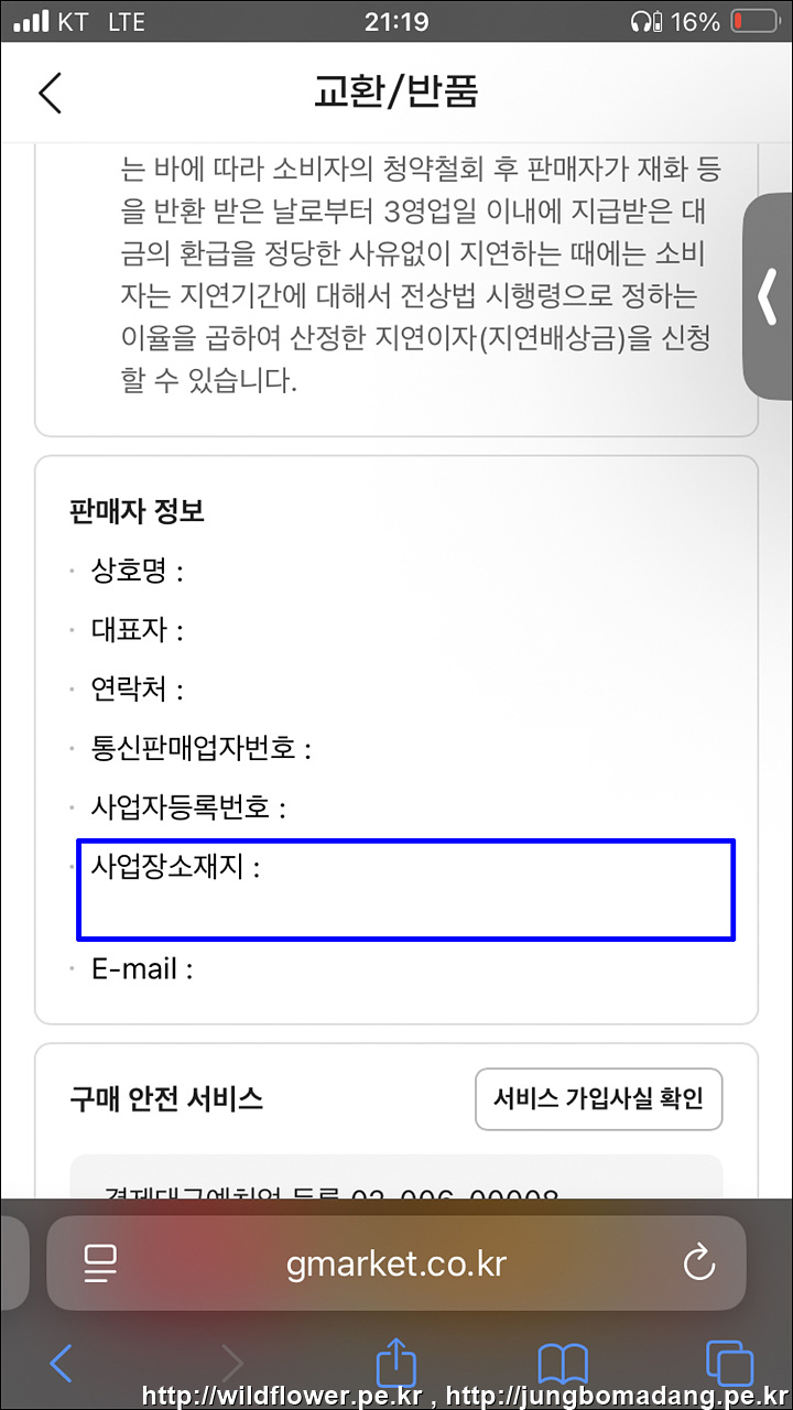 화면 하단의 판매자 정보에서 영업 소재지를 확인하면 됩니다.