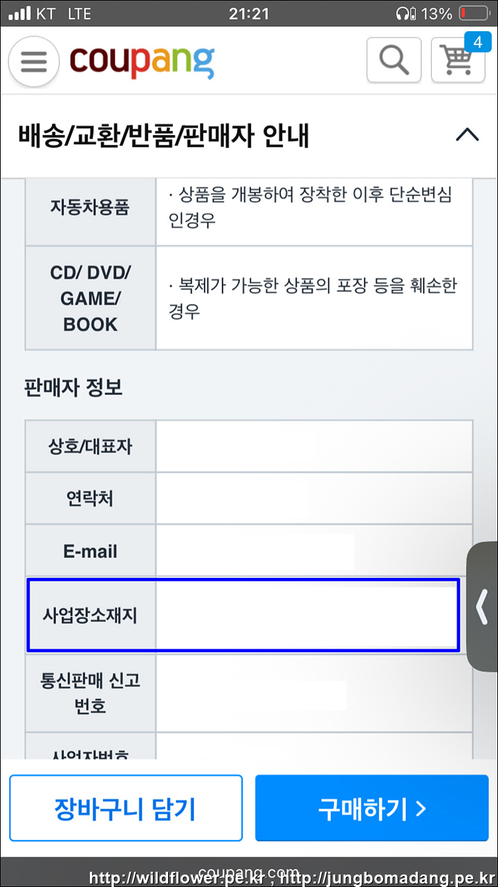 하단의 판매자 정보에서 사업장소재지를 확인하면 됩니다.