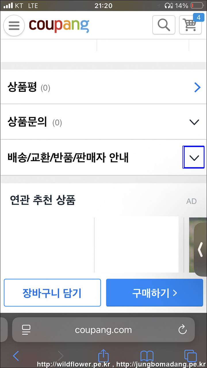 화면 하단의 배송/교환/반품/판매자 안내의 우측 V를 선택합니다.