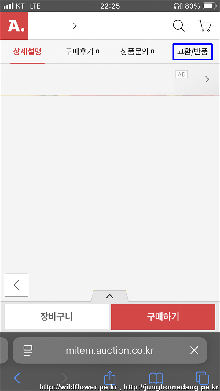 화면 중간의 상품평 상품문의 교환/반품에서 교환/반품을 선택합니다.
