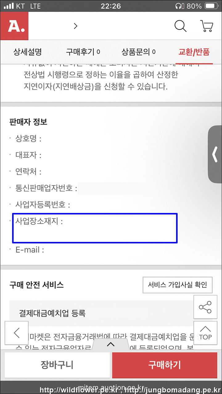 하단의 판매자 정보에서 사업장소재지를 확인하면 됩니다.
