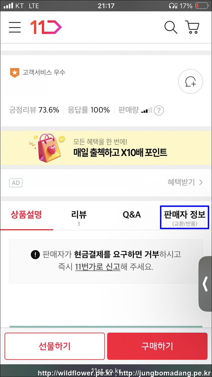 화면 중간의 상품설명 리뷰 Q/A 판매자 정보에서 판매자 정보를 선택합니다.