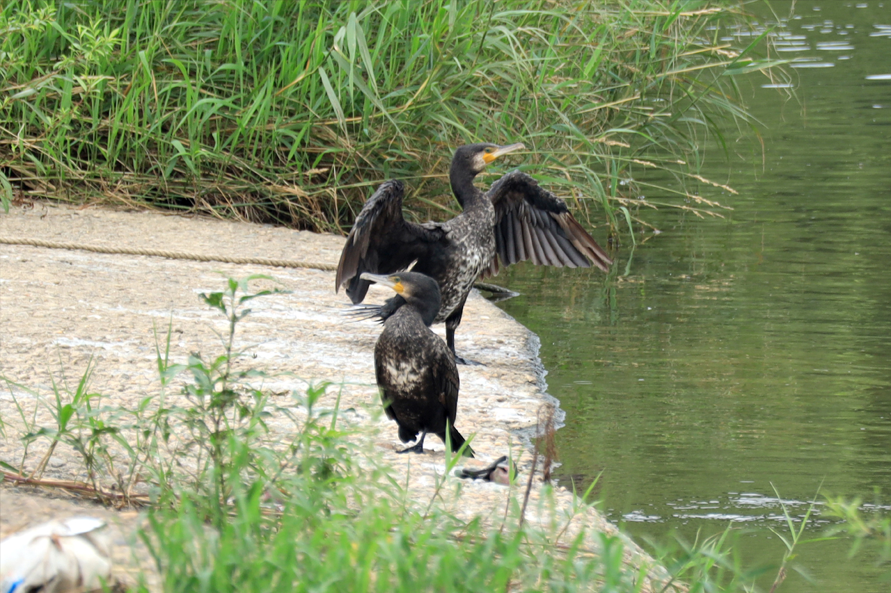 쇠백로 - 번식깃, 민물가마우지 - 크롭 사진입니다. 둘이 대치중입니다.