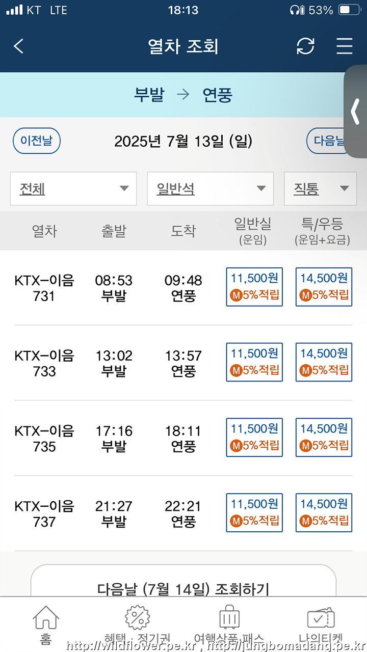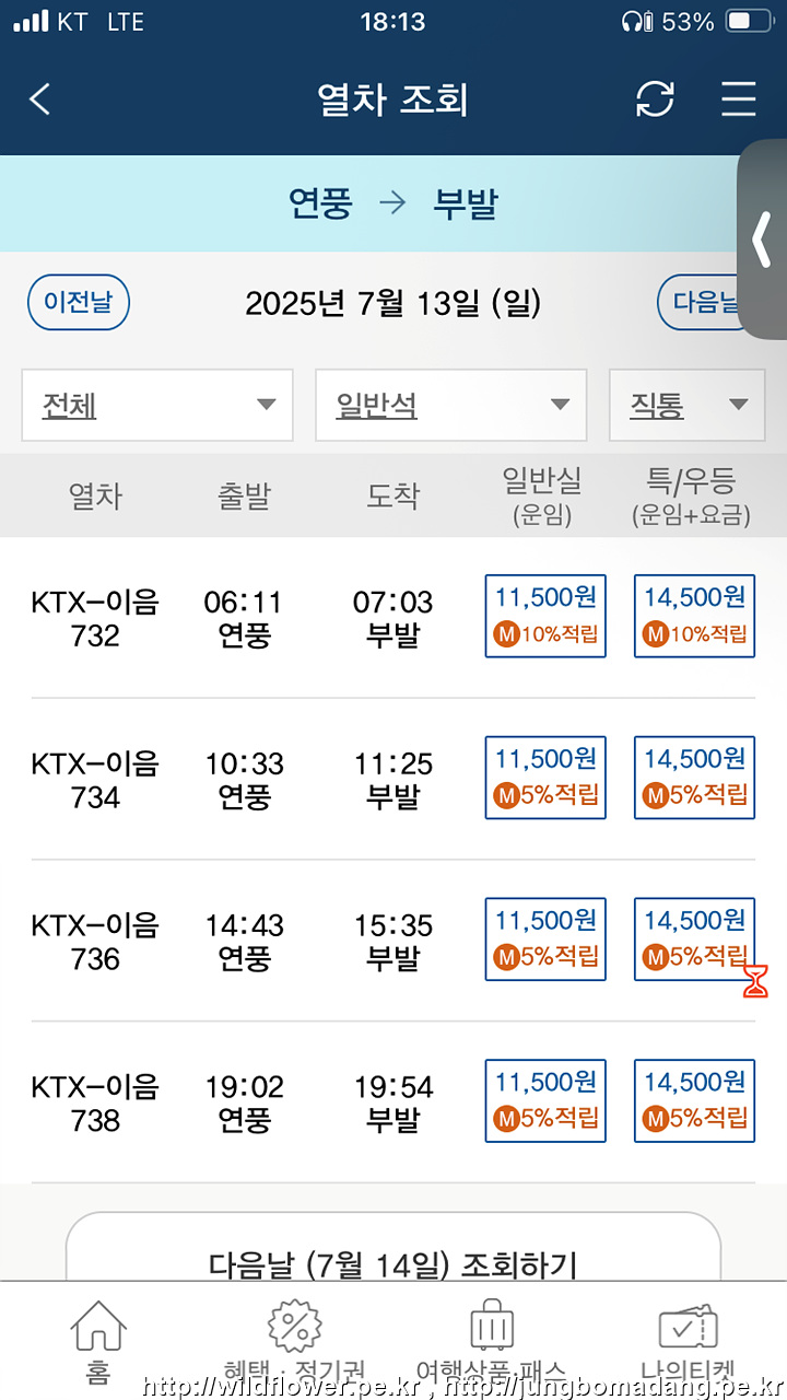 부발에서 연풍 KTX-이음 시간표 및 운임