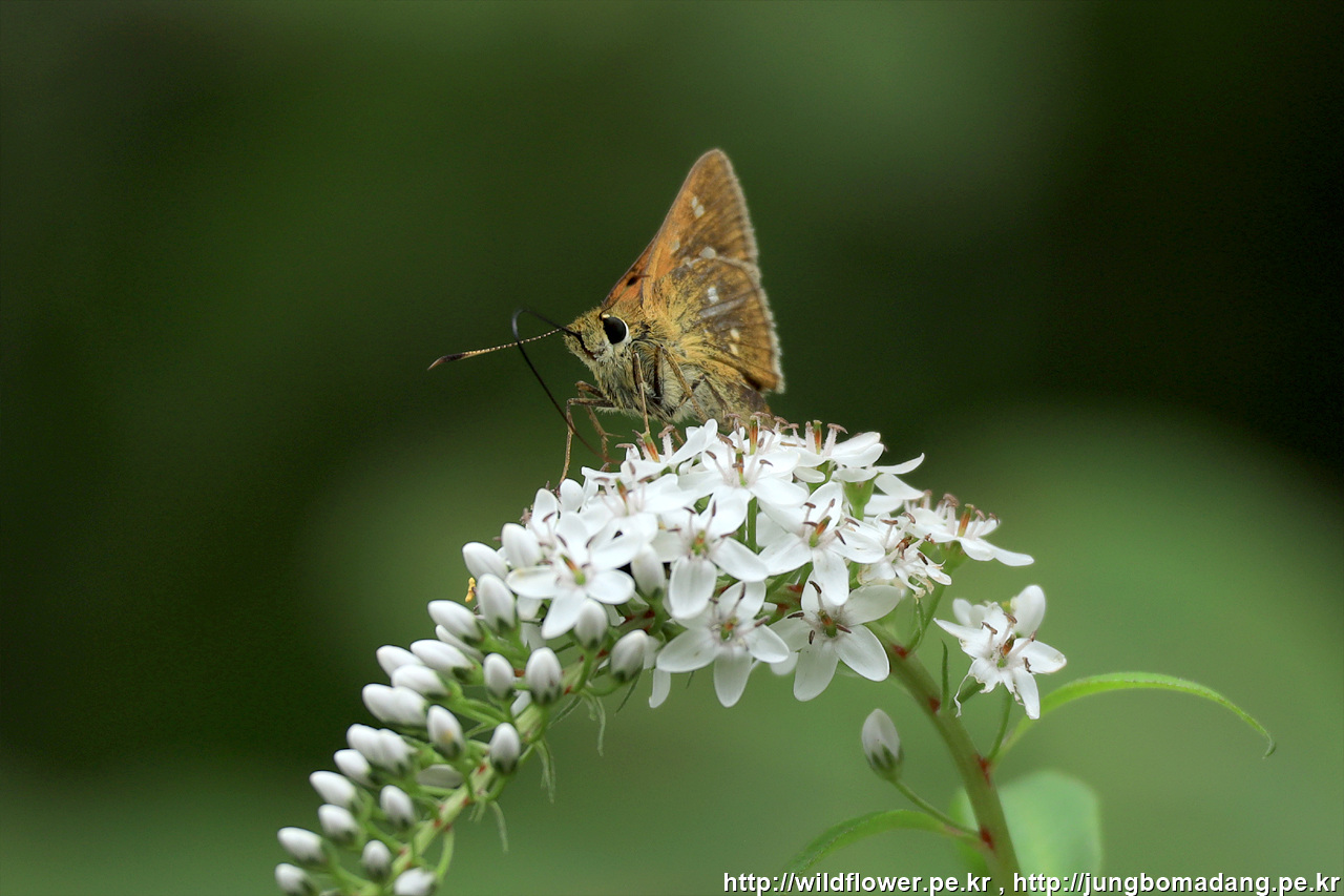 유리창떠들썩팔랑나비 - 큰까치수영 위에 앉아 있네요.
