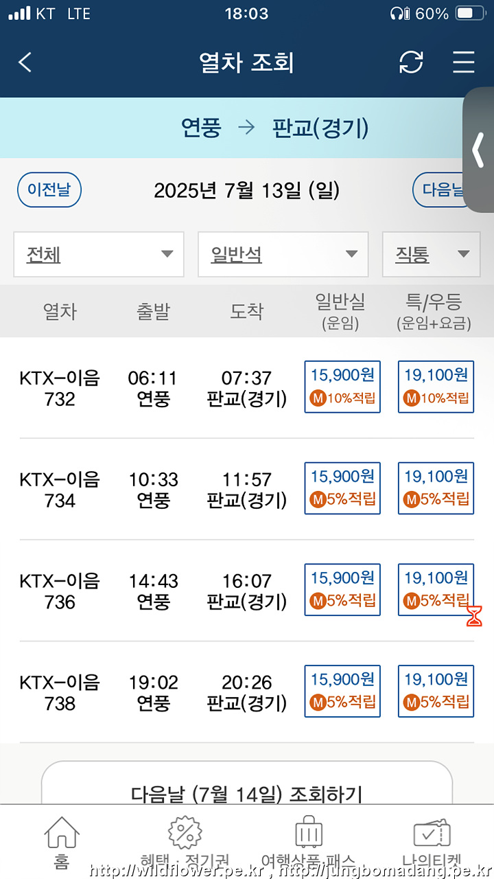 연풍에서 판교 KTX-이음 시간표 및 운임