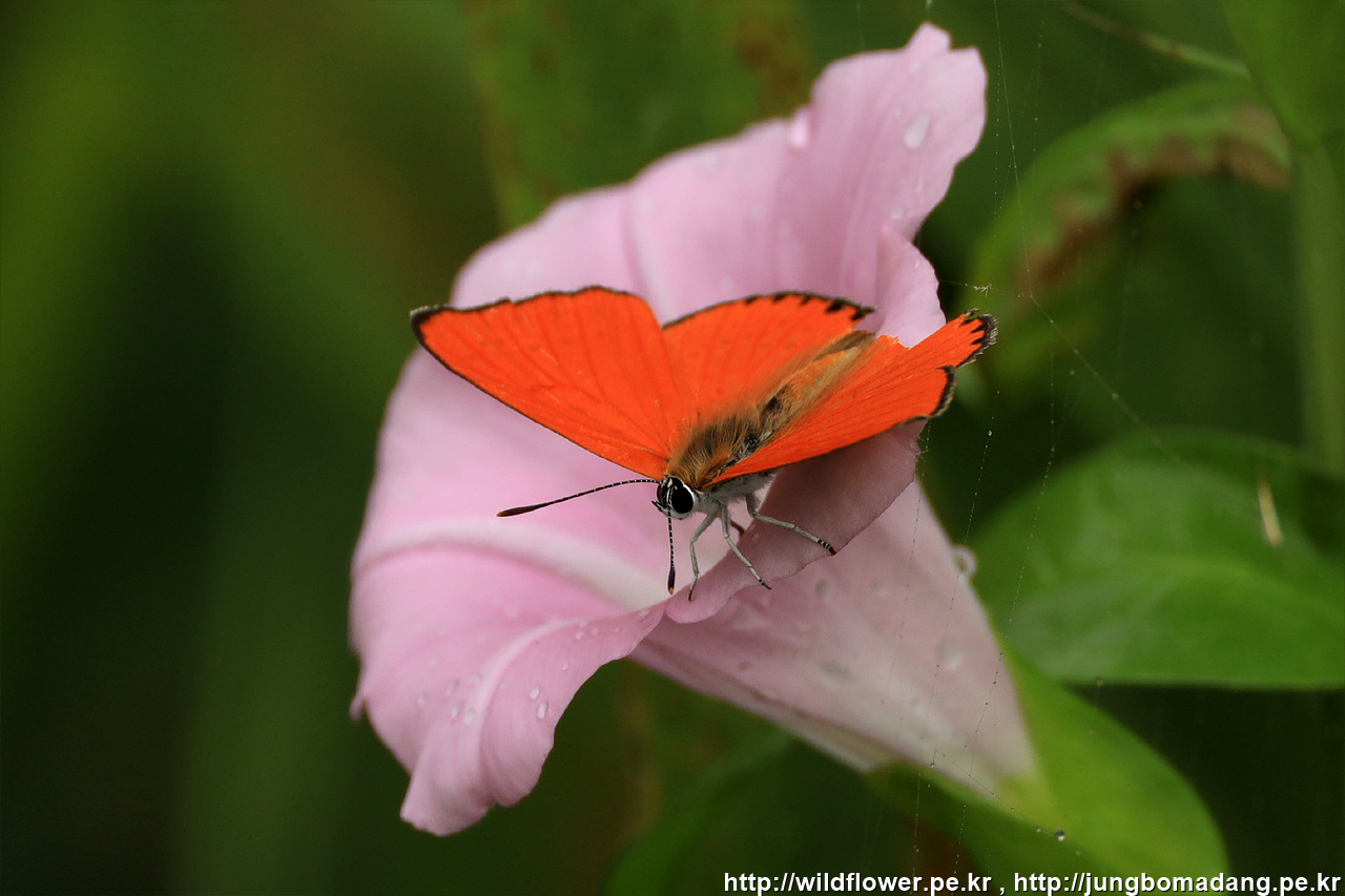 검은테주홍부전나비 - 수컷. 메꽃 위에 앉아 있습니다.