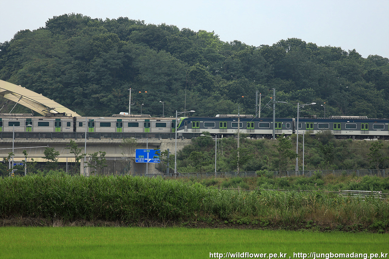 서해선 열차가 마주칩니다. 왼쪽 방면(어두운색)은 일산 대곡으로 가는 열차. 오른쪽 방면(밝은색)은 원시로 가는 열차.