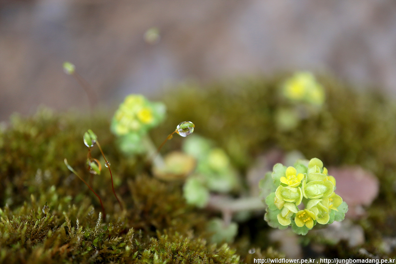 이끼에 포자낭에 맺힌 물방울과 우측에 괭이눈