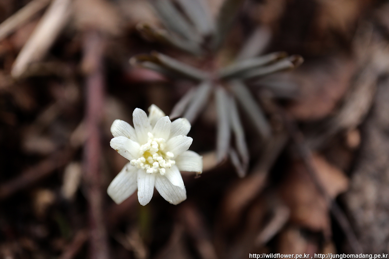 풍도바람꽃 - 변산바람꽃과의 차이점이 세가지가 있는 데, 허꽃(흰색) 끝이 뾰족하지 않고 둥글고, 허꽃이 5장이 넘기도 하며, 깔대기 모양의 꽃이 변산바람꽃에 비해 좀 더 넓은 것이 특징입니다.