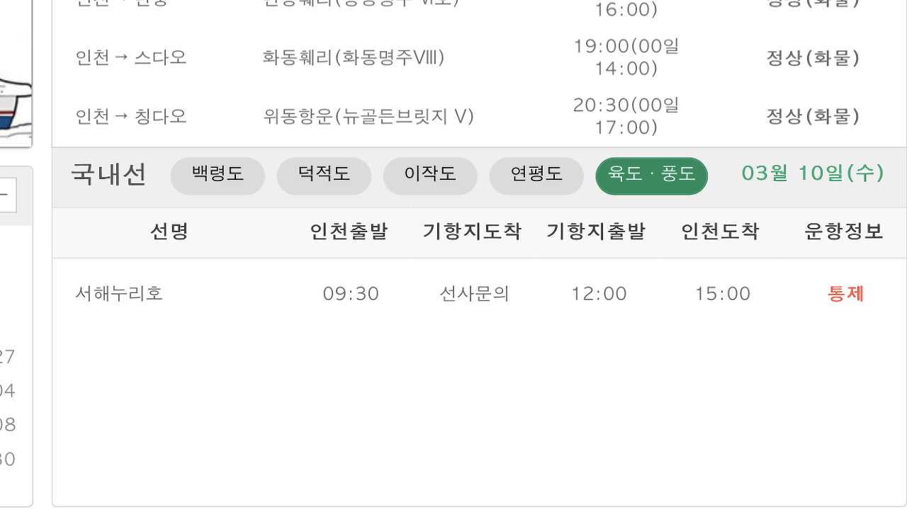 아큐웨더로 확인하니 인천쪽은 안개 표시가 사라지고 맑음으로 바뀌어 희망을 가졌는 데, 11시가 다 되어 결국 통제로 노선 운항이 취소된 상황을 겪게 됩니다.. 풍도 - 통 제. ㅠㅠ