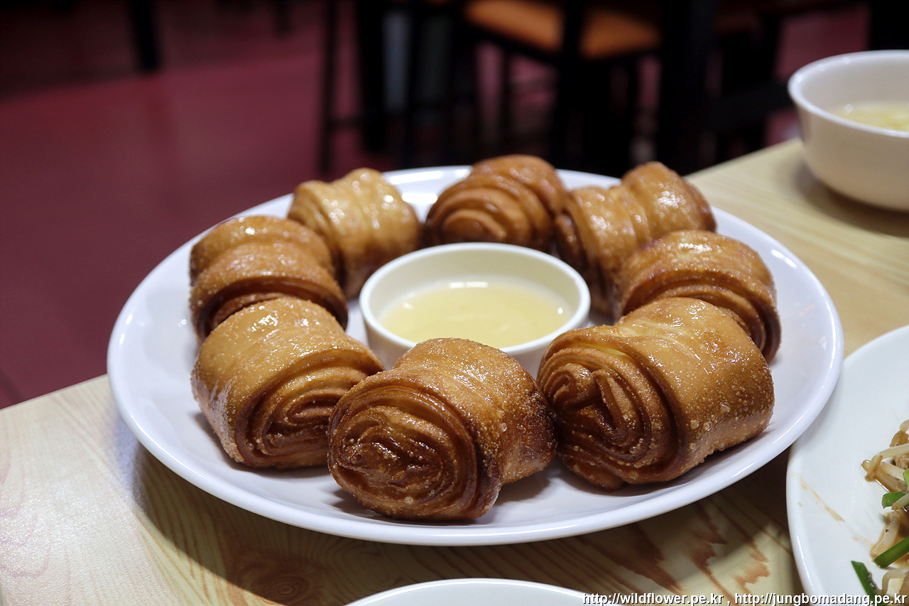 꽃빵 튀김. 가운데는 찍어 먹는 연유